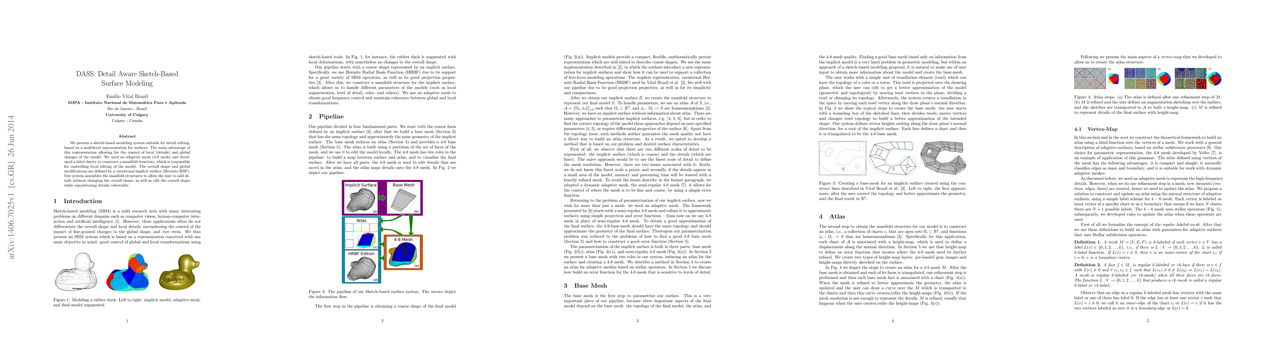 The DASS system enables sketch-based modeling with a multilevel representation for surfaces, allowing both local detail edits and global shape modifications through adaptive mesh and variational implicit surface techniques. It uses a manifold structure for coherent local editing while maintaining the overall model integrity.