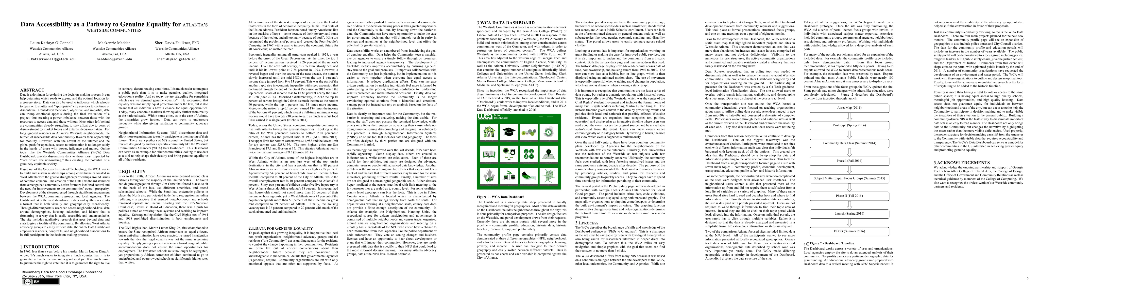 Data is a dominant force during the decision-making process. It can help determine which roads to expand and the optimal location for a grocery store. Data can also be used to influence which schools to open or to shutter and "appropriate" city services to continue or discontinue. Considered fact-based, objective, and impartial, data can trump emotional appeals during the final evaluation of a project; thus creating a power imbalance between those with the resources to access data and those without. Most often left behind are communities already struggling to stay afloat due to years of disinvestment by market forces and external decision-makers. For long ignored residents in Atlanta's Westside neighborhoods, the burden of inaccessible data continuously thwarts their opportunity for mobility. However, with the advent of the internet and the global push for open data, access to information is no longer solely in the hands of those with power, influence and money. Online tools, like the Westside Communities Alliance (WCA) Data Dashboard, quickly disseminate data to those most impacted by "data driven decision-making," thus creating the potential of a genuinely equitable society. Based out of the Georgia Institute of Technology, the WCA works to build and sustain relationships among constituencies located in West Atlanta with the goal to strengthen partnerships around issues of common concern. The creation of the Data Dashboard stemmed from a recognized community desire for more localized control and the need for improvements to the communities' overall prosperity. Development of the site progressed through significant engagement between the WCA, community groups, and local agencies. The Dashboard takes the vast abundance of data and synthesizes it into a format that is both visually and geographically user-friendly. Through different portals, users can access neighborhood-level data around demographics, housing, education, and history that is formatting in a way that is easily accessible and understandable. The site includes qualitative research that goes beyond data and stats to give a totality of the community. By allowing West Atlanta advocacy groups to easily retrieve data, the WCA Data Dashboard empowers residents, nonprofits, and neighborhood associations to be full participants in the decision-making process.