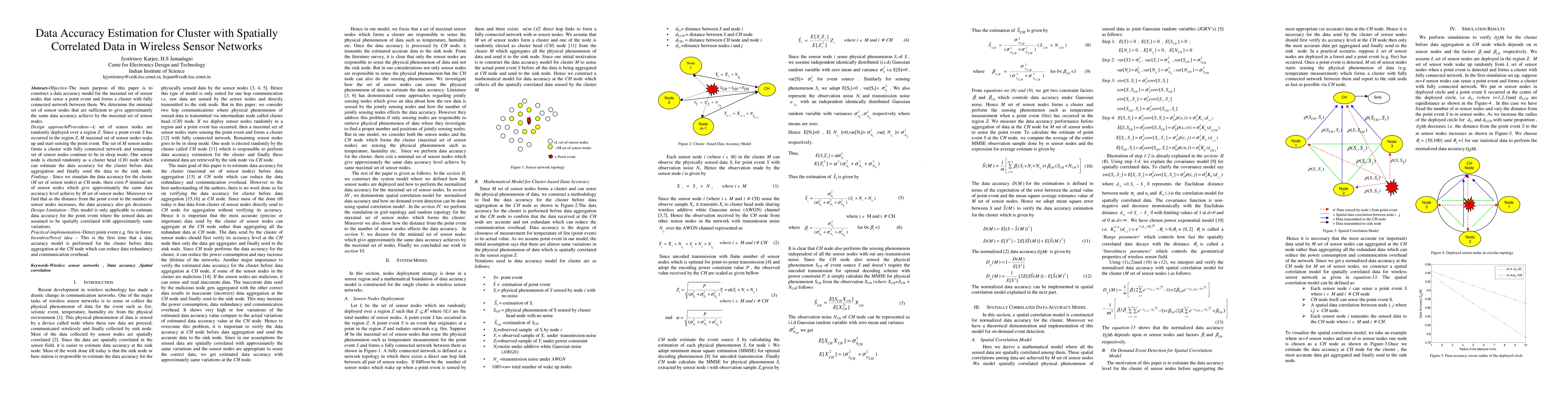 Objective-The main purpose of this paper is to construct a data accuracy model for the maximal set of sensor nodes that sense a point event and forms a cluster with fully connected network between them. We determine the minimal set of sensor nodes that are sufficient to give approximately the same data accuracy achieve by the maximal set of sensor nodes. Design approach/Procedure-L set of sensor nodes are randomly deployed over a region Z. Since a point event S has occurred in the region Z, M maximal set of sensor nodes wake up and start sensing the point event. The set of M sensor nodes forms a cluster with fully connected network and remaining set of sensor nodes continue to be in sleep mode. One sensor node is elected randomly as a cluster head (CH) node which can estimate the data accuracy for the cluster before data aggregation and finally send the data to the sink node. Findings - Since we simulate the data accuracy for the cluster (M set of sensor nodes) at CH node, there exist P minimal set of sensor nodes which give approximately the same data accuracy level achieve by M set of sensor nodes .Moreover we find that as the distance from the point event to the number of sensor nodes increases, the data accuracy also get decreases. Design Limitation -This model is only applicable to estimate data accuracy for the point event where the sensed data are assumed to be spatially correlated with approximately same variations. Practical implementation-Detect point event e.g. fire in forest. Inventive/Novel idea - This is the first time that a data accuracy model is performed for the cluster before data aggregation at the CH node which can reduce data redundancy and communication overhead.