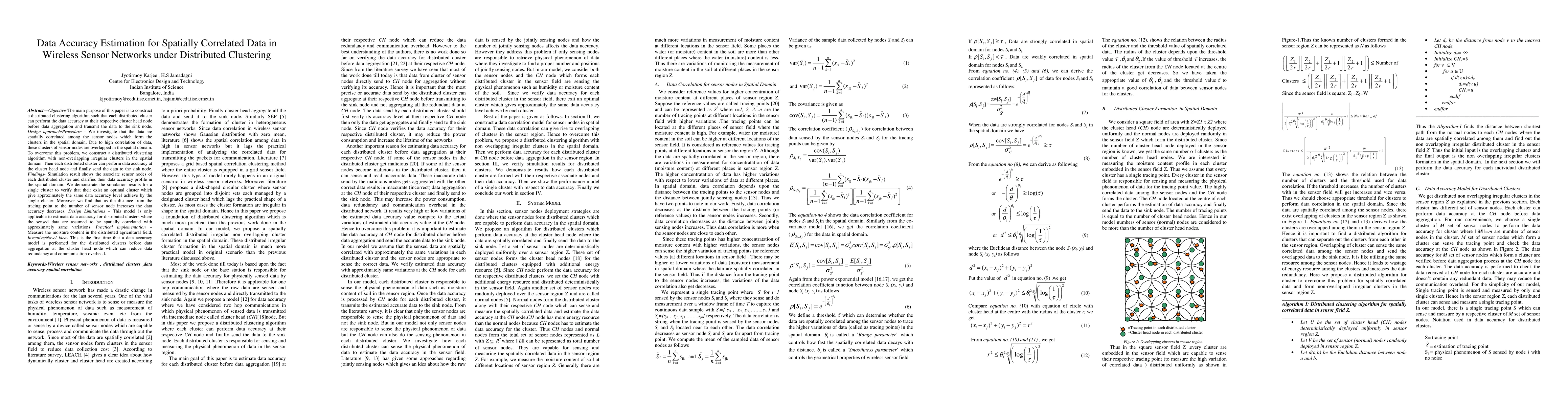 This paper proposes a distributed clustering algorithm for spatially correlated data in wireless sensor networks, enabling each cluster to assess data accuracy at the cluster head before aggregation. The algorithm creates non-overlapping clusters to mitigate data redundancy, improving data accuracy estimation and reducing communication overhead.