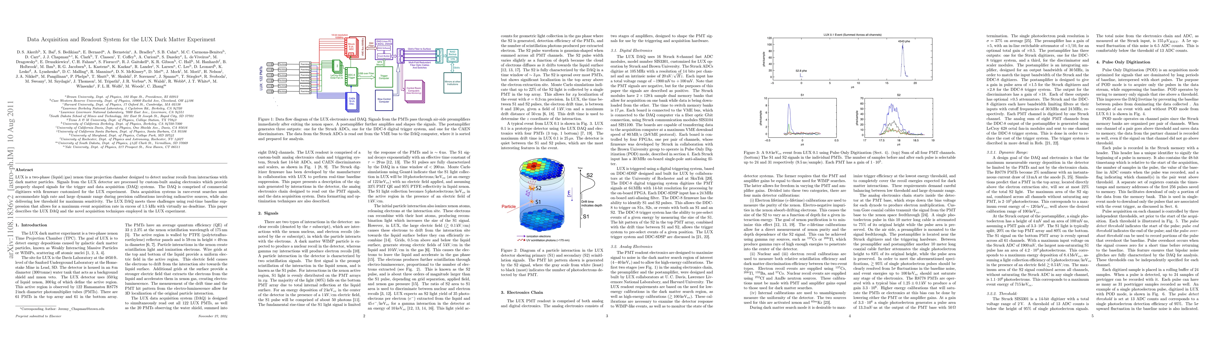 The LUX experiment employs a custom-built data acquisition system with high-rate digitizers and real-time baseline suppression to detect dark matter interactions in a two-phase xenon detector, achieving an acquisition rate of over 1.5 kHz with minimal deadtime. The system's design ensures maximum sensitivity and precision during calibrations.