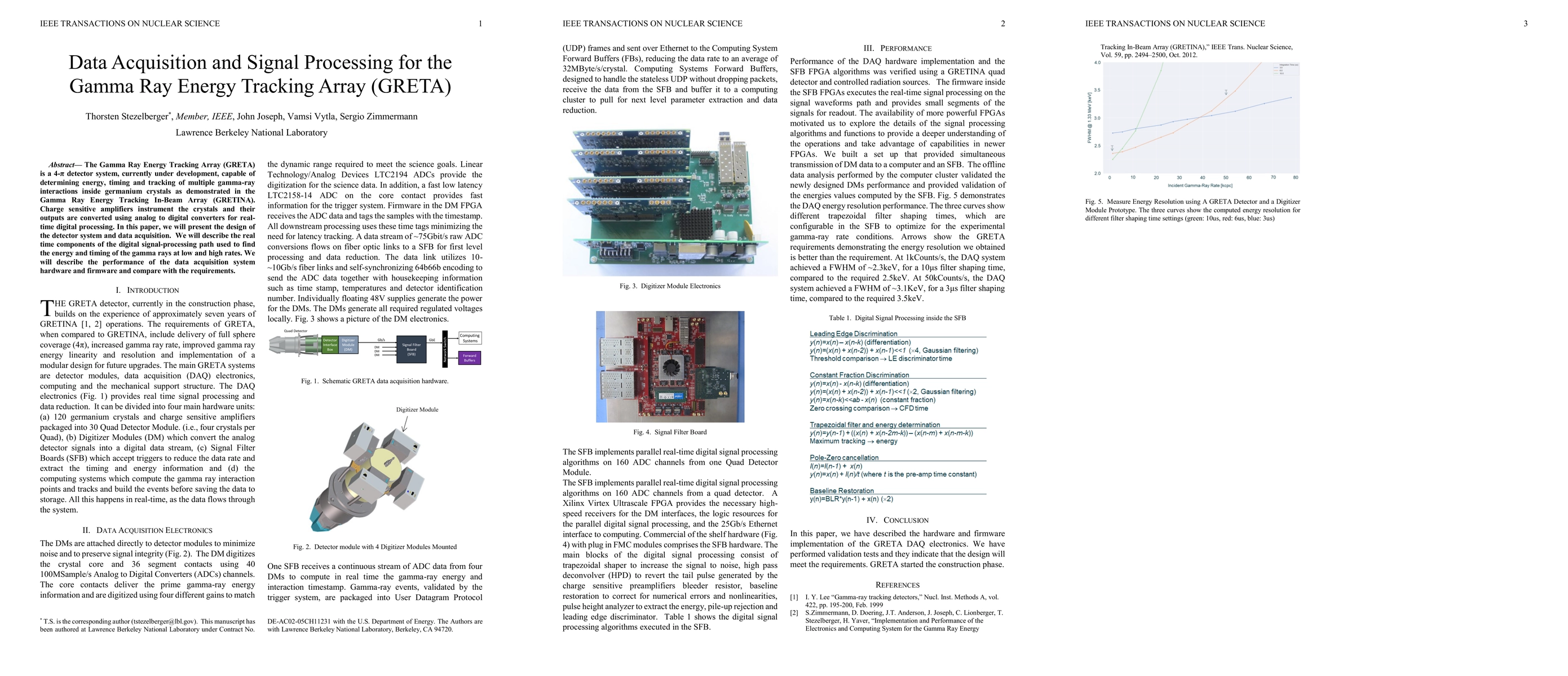 The Gamma Ray Energy Tracking Array (GRETA) is a 4-{\pi} detector system, currently under development, capable of determining energy, timing and tracking of multiple gamma-ray interactions inside germanium crystals as demonstrated in the Gamma Ray Energy Tracking In-Beam Array (GRETINA). Charge sensitive amplifiers instrument the crystals and their outputs are converted using analog to digital converters for real-time digital processing. In this paper, we will present the design of the detector system and data acquisition. We will describe the real time components of the digital signal-processing path used to find the energy and timing of the gamma rays at low and high rates. We will describe the performance of the data acquisition system hardware and firmware and compare with the requirements.