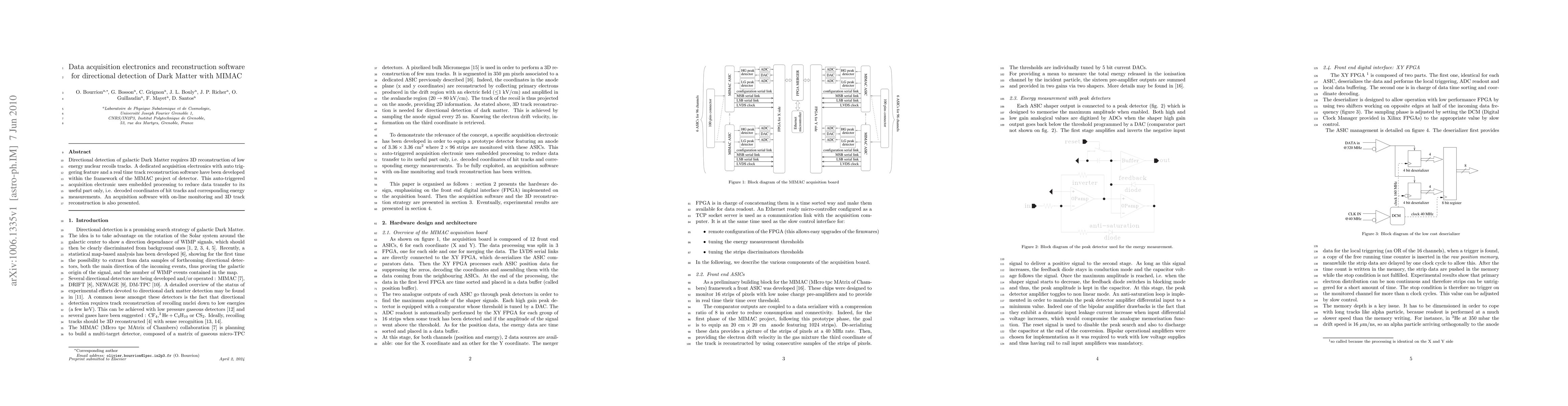 The MIMAC project developed specialized acquisition electronics and reconstruction software for directional detection of Dark Matter by reconstructing 3D tracks of low energy nuclear recoils, utilizing auto-triggering and embedded processing to minimize data transfer. The software also provides real-time monitoring and 3D track reconstruction capabilities.