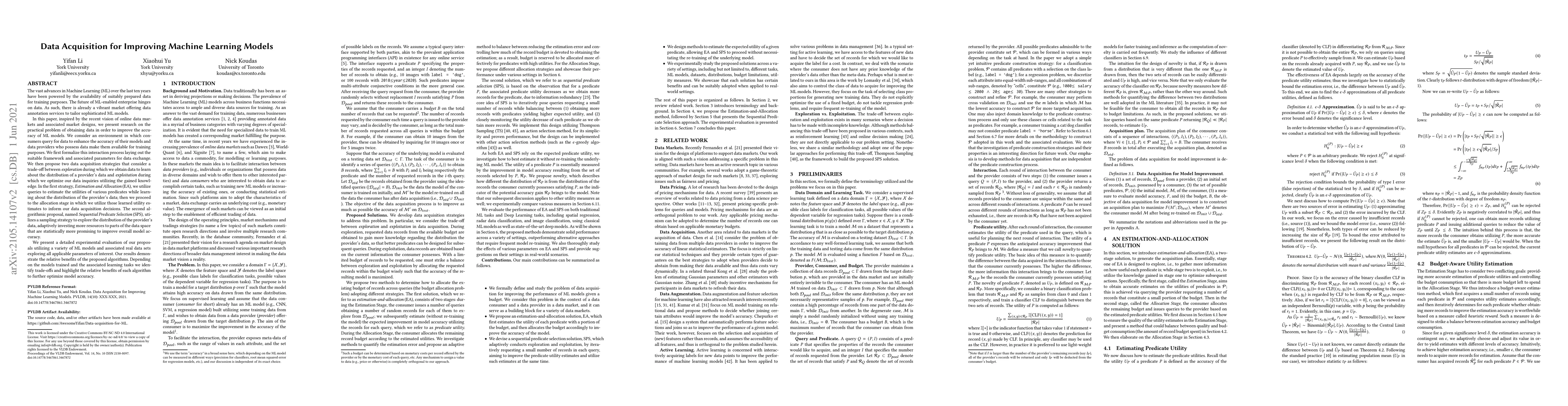 The vast advances in Machine Learning over the last ten years have been powered by the availability of suitably prepared data for training purposes. The future of ML-enabled enterprise hinges on data. As such, there is already a vibrant market offering data annotation services to tailor sophisticated ML models. In this paper, we present research on the practical problem of obtaining data in order to improve the accuracy of ML models. We consider an environment in which consumers query for data to enhance the accuracy of their models and data providers who possess data make them available for training purposes. We first formalize this interaction process laying out the suitable framework and associated parameters for data exchange. We then propose two data acquisition strategies that consider a trade-off between exploration during which we obtain data to learn about the distribution of a provider's data and exploitation during which we optimize our data inquiries utilizing the gained knowledge. In the first strategy, Estimation and Allocation, we utilize queries to estimate the utilities of various predicates while learning about the distribution of the provider's data; then we proceed to the allocation stage in which we utilize those learned utility estimates to inform our data acquisition decisions. The second algorithmic proposal, named Sequential Predicate Selection, utilizes a sampling strategy to explore the distribution of the provider's data, adaptively investing more resources to parts of the data space that are statistically more promising to improve overall model accuracy. We present a detailed experimental evaluation of our proposals utilizing a variety of ML models and associated real data sets exploring all applicable parameters of interest. We identify trade-offs and highlight the relative benefits of each algorithm to further optimize model accuracy.