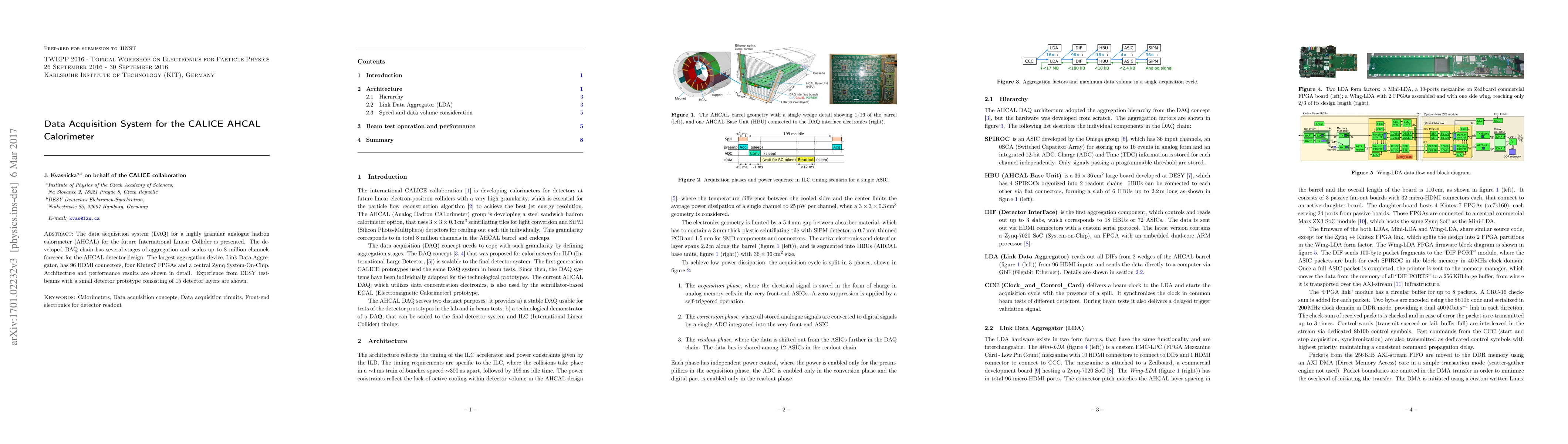 The paper presents a data acquisition system for the CALICE AHCAL calorimeter, designed to handle up to 8 million channels with a multi-stage aggregation architecture, featuring the Link Data Aggregator with 96 HDMI connectors and four Kintex7 FPGAs. Performance results and testbeam experiences from a prototype with 15 detector layers are detailed.