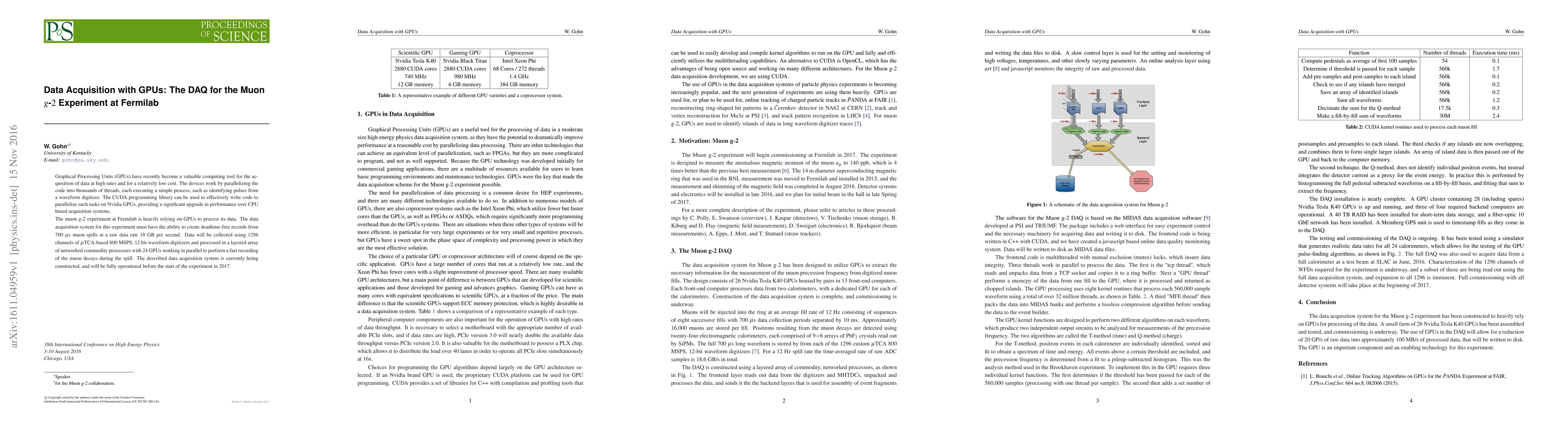 This paper discusses the use of GPUs for data acquisition in the Muon $g$-$2$ experiment at Fermilab, highlighting the significant performance improvements over CPU-based systems. The system employs 24 parallel GPUs to handle 18 GB per second of data from 1296 channels of high-speed digitizers, ensuring deadtime-free records for muon decay events.