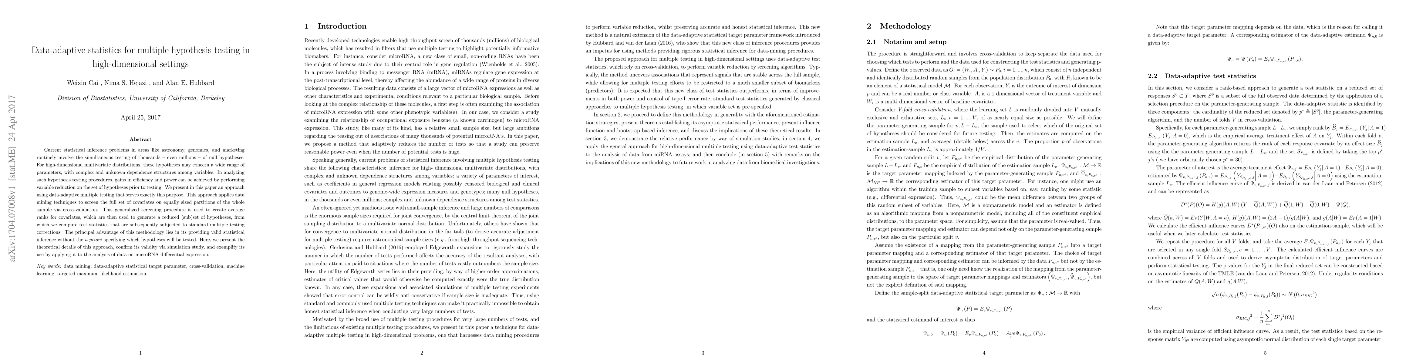 This paper proposes a data-adaptive method for multiple hypothesis testing in high-dimensional settings, employing data mining techniques to reduce the number of hypotheses through cross-validation and ranking. The approach ensures valid statistical inference without requiring prior specification of hypotheses.