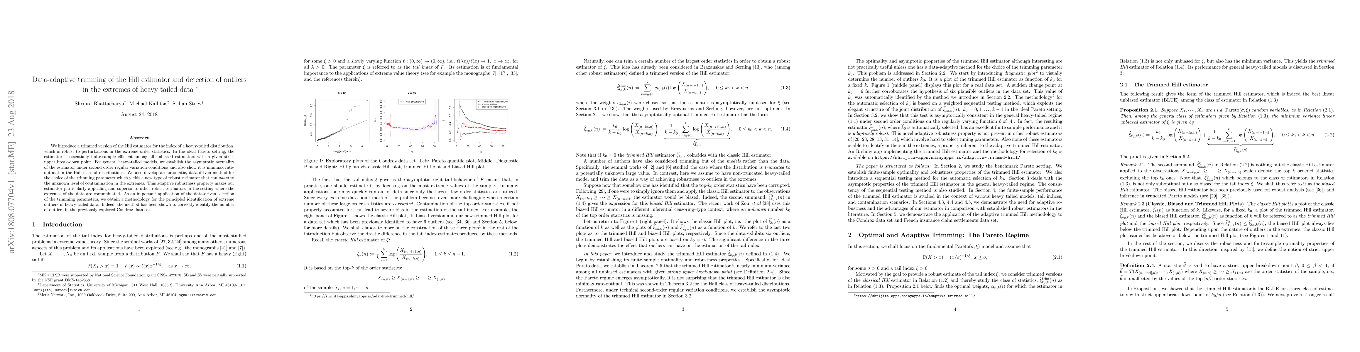 We introduce a trimmed version of the Hill estimator for the index of a heavy-tailed distribution, which is robust to perturbations in the extreme order statistics. In the ideal Pareto setting, the estimator is essentially finite-sample efficient among all unbiased estimators with a given strict upper break-down point. For general heavy-tailed models, we establish the asymptotic normality of the estimator under second order regular variation conditions and also show it is minimax rate-optimal in the Hall class of distributions. We also develop an automatic, data-driven method for the choice of the trimming parameter which yields a new type of robust estimator that can adapt to the unknown level of contamination in the extremes. This adaptive robustness property makes our estimator particularly appealing and superior to other robust estimators in the setting where the extremes of the data are contaminated. As an important application of the data-driven selection of the trimming parameters, we obtain a methodology for the principled identification of extreme outliers in heavy tailed data. Indeed, the method has been shown to correctly identify the number of outliers in the previously explored Condroz data set.