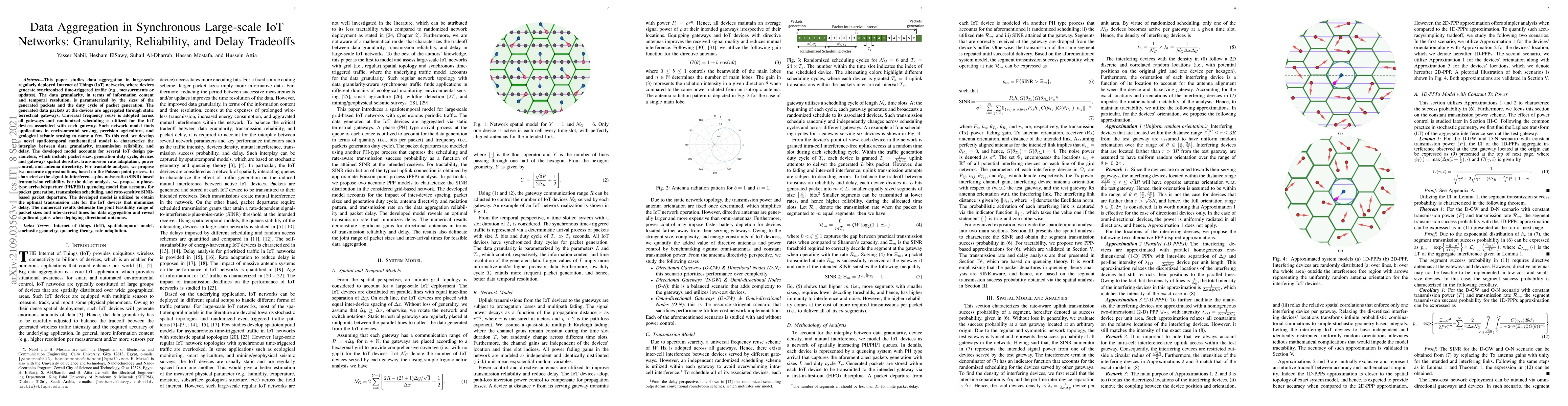 This paper investigates data aggregation in large-scale IoT networks, focusing on the trade-offs between data granularity, transmission reliability, and delay. It develops a mathematical model to analyze these factors and proposes approximations to optimize transmission rate, revealing significant benefits from directional antennas.