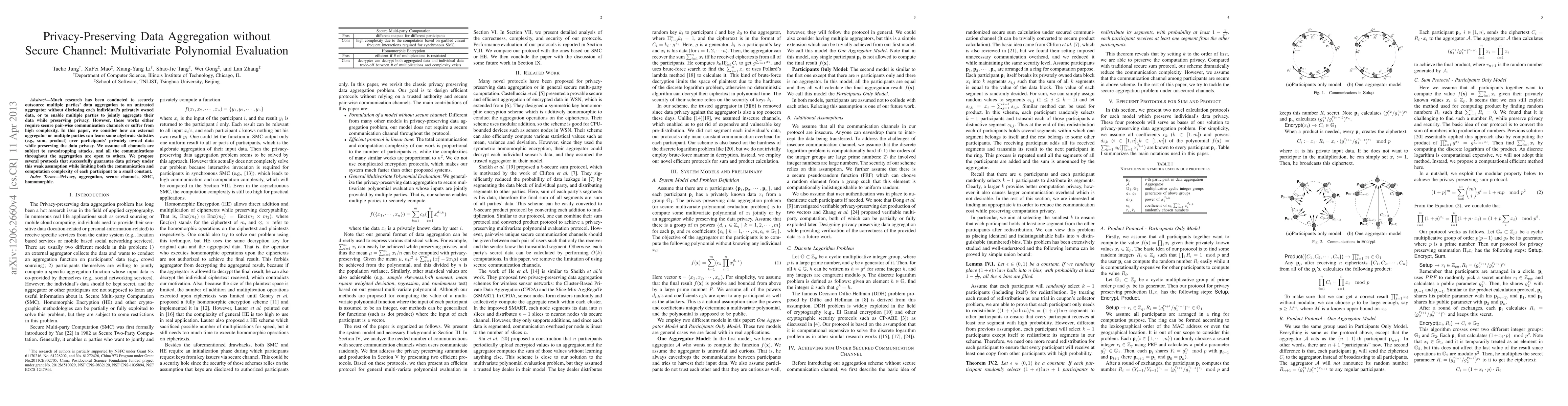 Much research has been conducted to securely outsource multiple parties' data aggregation to an untrusted aggregator without disclosing each individual's data, or to enable multiple parties to jointly aggregate their data while preserving privacy. However, those works either assume to have a secure channel or suffer from high complexity. Here we consider how an external aggregator or multiple parties learn some algebraic statistics (e.g., summation, product) over participants' data while any individual's input data is kept secret to others (the aggregator and other participants). We assume channels in our construction are insecure. That is, all channels are subject to eavesdropping attacks, and all the communications throughout the aggregation are open to others. We successfully guarantee data confidentiality under this weak assumption while limiting both the communication and computation complexity to at most linear.