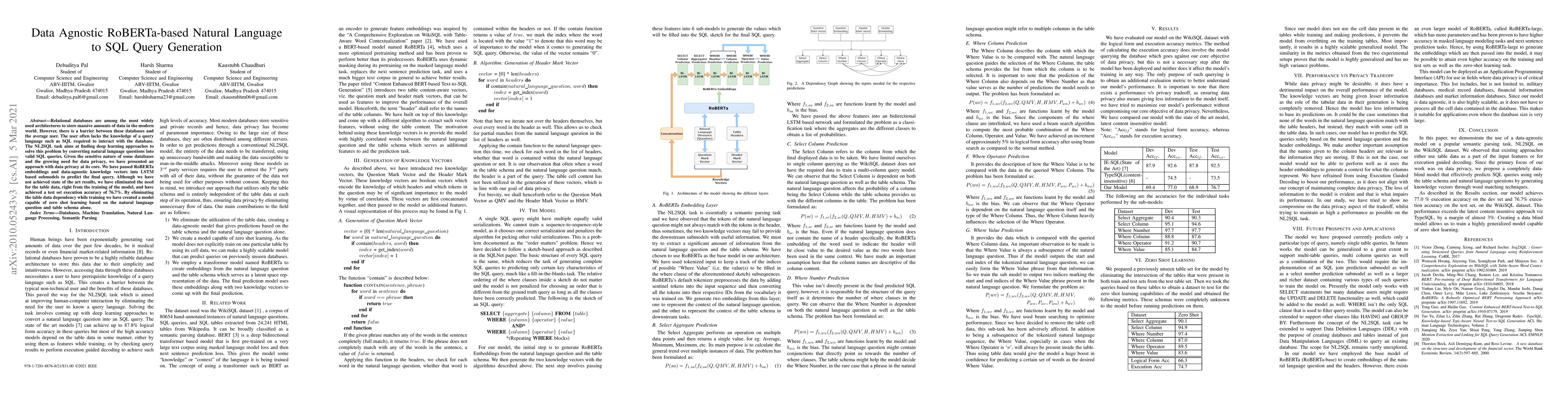 This paper presents a RoBERTa-based model for natural language to SQL query generation that prioritizes data privacy by training data-agnostically. The model achieves 76.7% test set execution accuracy and enables zero-shot learning without requiring table data during training.