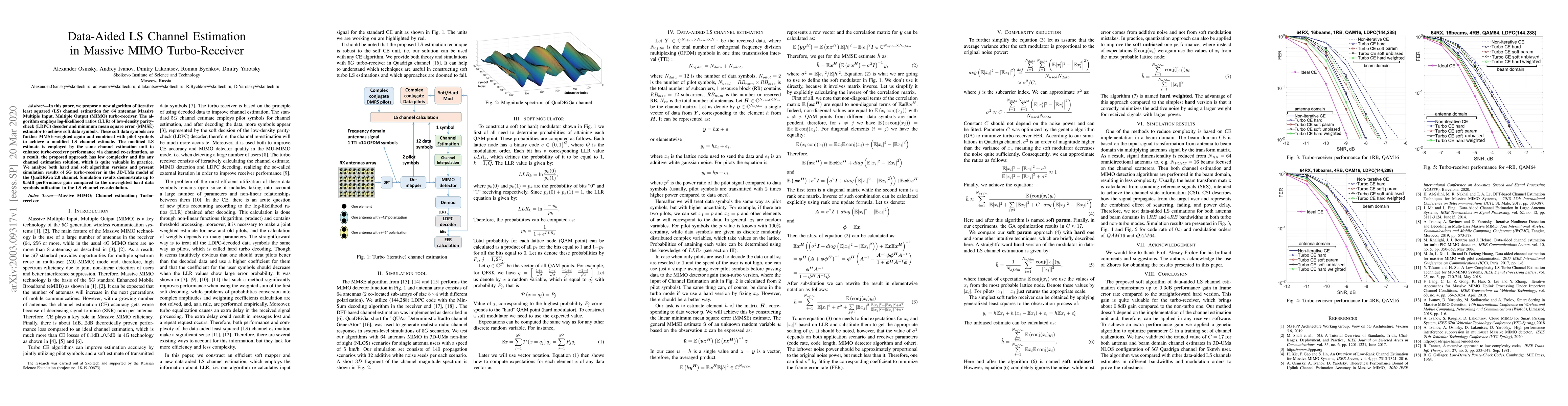 This paper introduces a new iterative least squared channel estimation algorithm for a 64-antenna Massive MIMO turbo-receiver, combining log-likelihood ratios from LDPC decoding and MMSE estimation to enhance performance. Simulation results show up to 0.3dB gain over traditional methods in 5G scenarios.