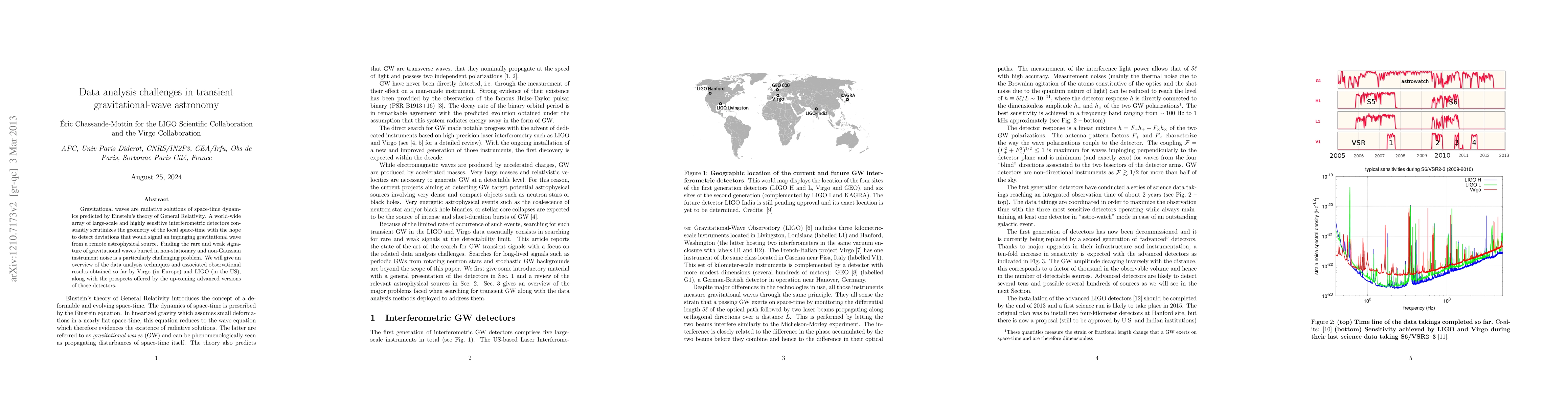 Gravitational waves are radiative solutions of space-time dynamics predicted by Einstein's theory of General Relativity. A world-wide array of large-scale and highly sensitive interferometric detectors constantly scrutinizes the geometry of the local space-time with the hope to detect deviations that would signal an impinging gravitational wave from a remote astrophysical source. Finding the rare and weak signature of gravitational waves buried in non-stationary and non-Gaussian instrument noise is a particularly challenging problem. We will give an overview of the data-analysis techniques and associated observational results obtained so far by Virgo (in Europe) and LIGO (in the US), along with the prospects offered by the up-coming advanced versions of those detectors.