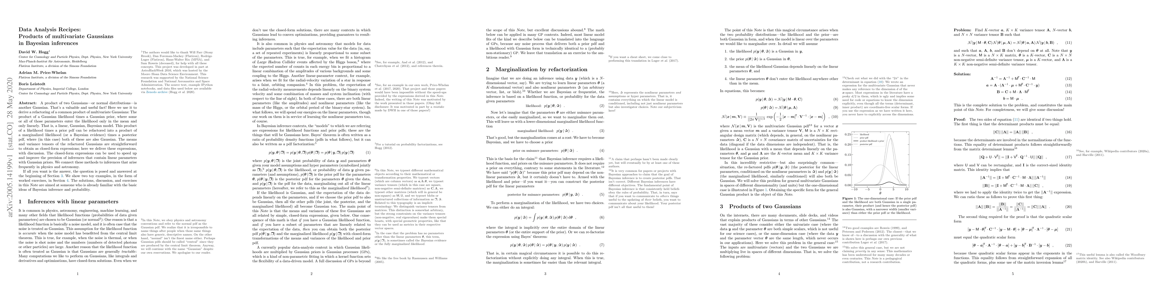 A product of two Gaussians (or normal distributions) is another Gaussian. That's a valuable and useful fact! Here we use it to derive a refactoring of a common product of multivariate Gaussians: The product of a Gaussian likelihood times a Gaussian prior, where some or all of those parameters enter the likelihood only in the mean and only linearly. That is, a linear, Gaussian, Bayesian model. This product of a likelihood times a prior pdf can be refactored into a product of a marginalized likelihood (or a Bayesian evidence) times a posterior pdf, where (in this case) both of these are also Gaussian. The means and variance tensors of the refactored Gaussians are straightforward to obtain as closed-form expressions; here we deliver these expressions, with discussion. The closed-form expressions can be used to speed up and improve the precision of inferences that contain linear parameters with Gaussian priors. We connect these methods to inferences that arise frequently in physics and astronomy. If all you want is the answer, the question is posed and answered at the beginning of Section 3. We show two toy examples, in the form of worked exercises, in Section 4. The solutions, discussion, and exercises in this Note are aimed at someone who is already familiar with the basic ideas of Bayesian inference and probability.