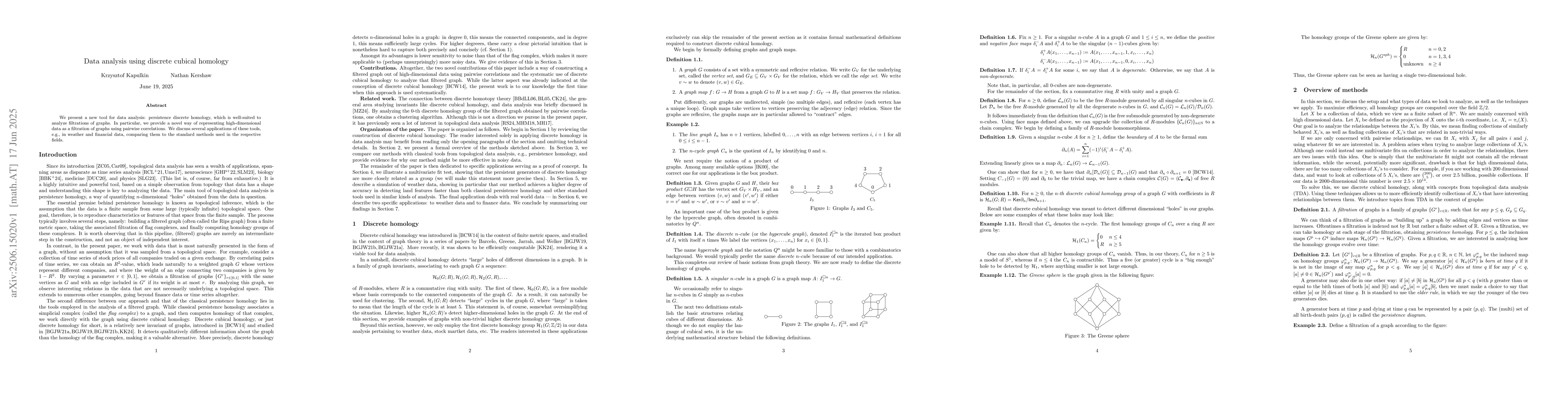 We present a new tool for data analysis: persistence discrete homology, which is well-suited to analyze filtrations of graphs. In particular, we provide a novel way of representing high-dimensional data as a filtration of graphs using pairwise correlations. We discuss several applications of these tools, e.g., in weather and financial data, comparing them to the standard methods used in the respective fields.