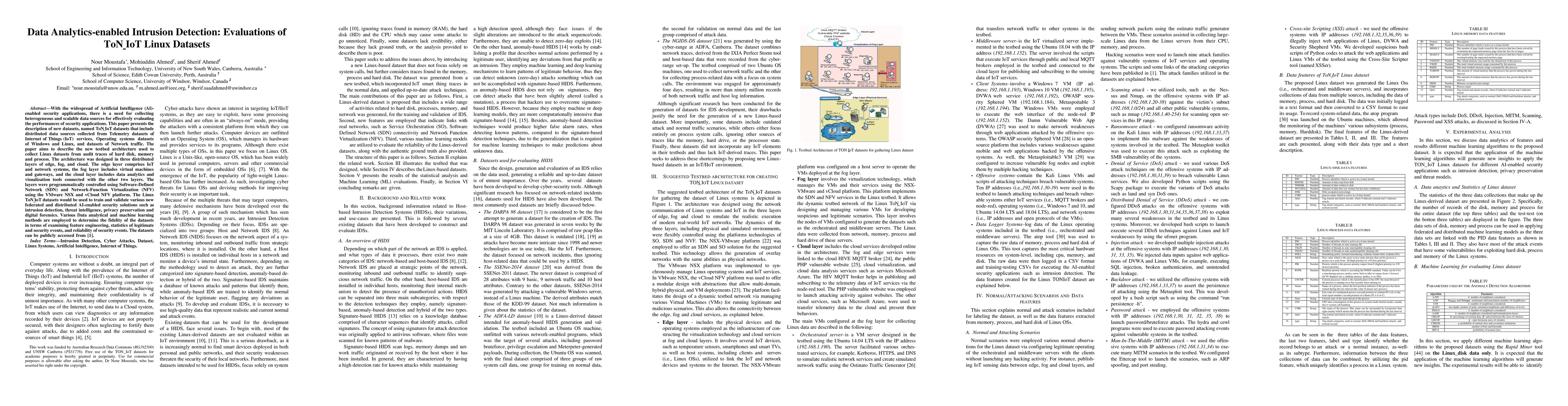 With the widespread of Artificial Intelligence (AI)- enabled security applications, there is a need for collecting heterogeneous and scalable data sources for effectively evaluating the performances of security applications. This paper presents the description of new datasets, named ToN IoT datasets that include distributed data sources collected from Telemetry datasets of Internet of Things (IoT) services, Operating systems datasets of Windows and Linux, and datasets of Network traffic. The paper aims to describe the new testbed architecture used to collect Linux datasets from audit traces of hard disk, memory and process. The architecture was designed in three distributed layers of edge, fog, and cloud. The edge layer comprises IoT and network systems, the fog layer includes virtual machines and gateways, and the cloud layer includes data analytics and visualization tools connected with the other two layers. The layers were programmatically controlled using Software-Defined Network (SDN) and Network-Function Virtualization (NFV) using the VMware NSX and vCloud NFV platform. The Linux ToN IoT datasets would be used to train and validate various new federated and distributed AI-enabled security solutions such as intrusion detection, threat intelligence, privacy preservation and digital forensics. Various Data analytical and machine learning methods are employed to determine the fidelity of the datasets in terms of examining feature engineering, statistics of legitimate and security events, and reliability of security events. The datasets can be publicly accessed from [1].