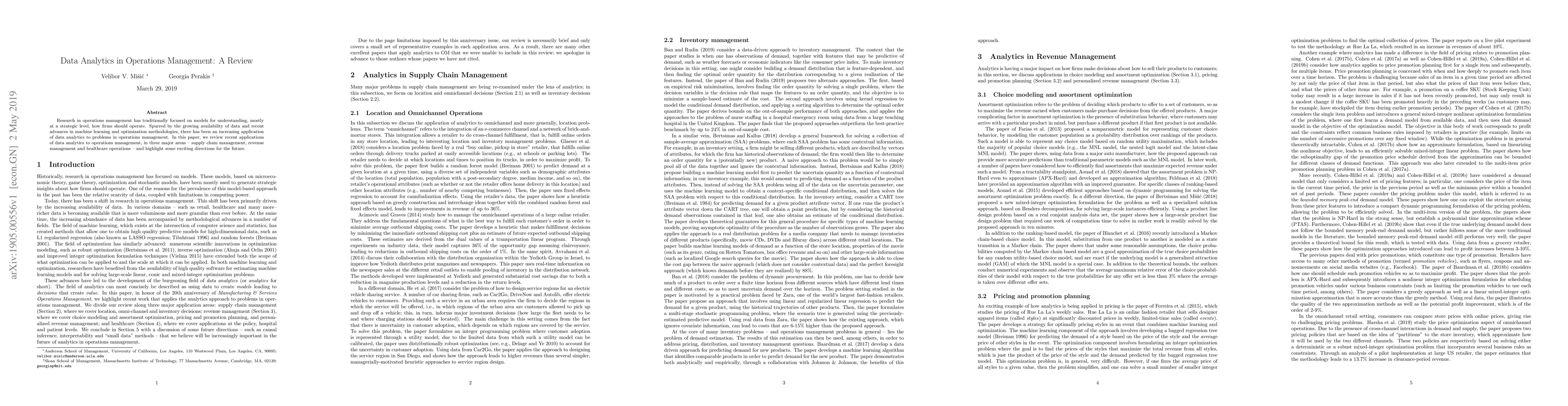 This paper reviews recent applications of data analytics in operations management, focusing on supply chain management, revenue management, and healthcare operations. It highlights the growing use of data analytics, driven by machine learning and optimization, and suggests promising future directions.