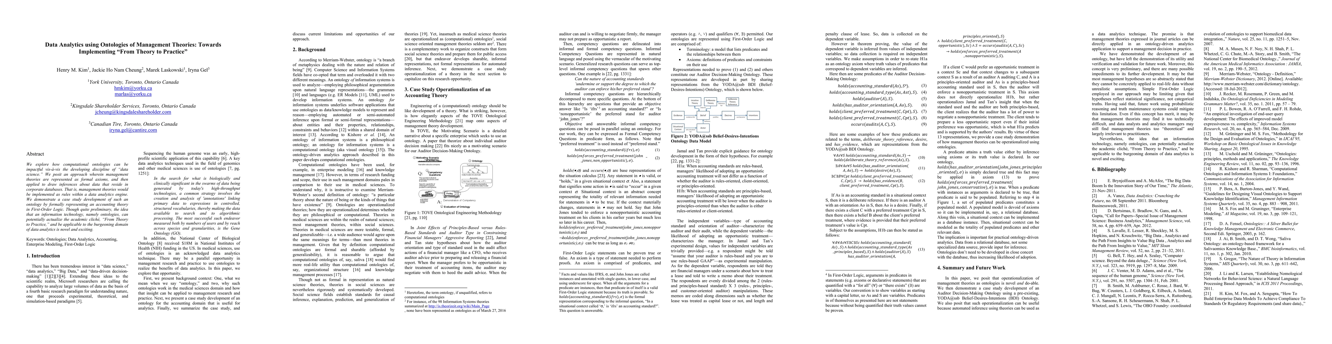 We explore how computational ontologies can be impactful vis-a-vis the developing discipline of "data science." We posit an approach wherein management theories are represented as formal axioms, and then applied to draw inferences about data that reside in corporate databases. That is, management theories would be implemented as rules within a data analytics engine. We demonstrate a case study development of such an ontology by formally representing an accounting theory in First-Order Logic. Though quite preliminary, the idea that an information technology, namely ontologies, can potentially actualize the academic cliche, "From Theory to Practice," and be applicable to the burgeoning domain of data analytics is novel and exciting.