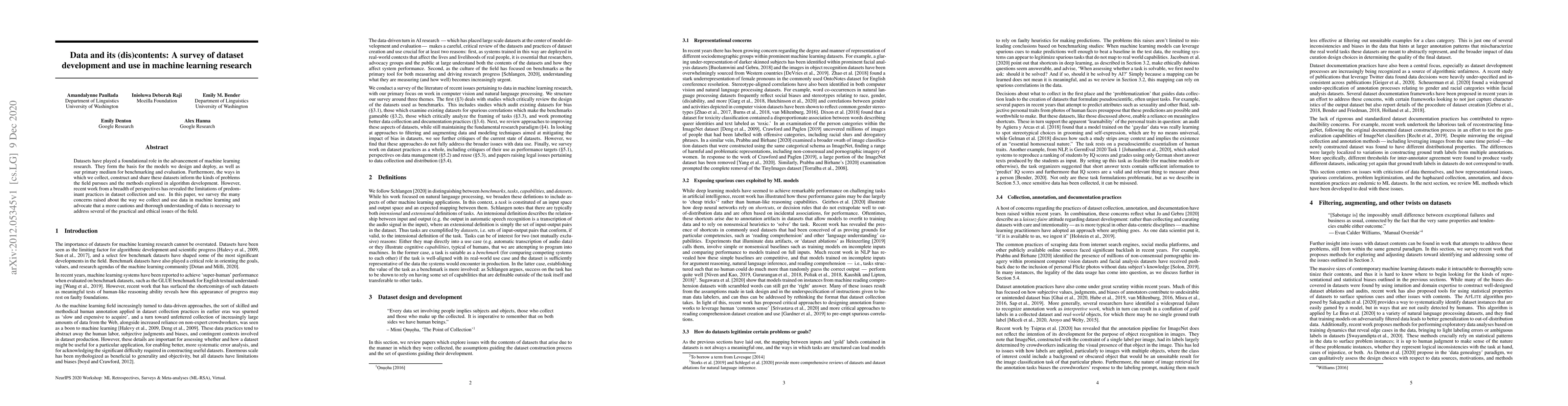 A survey of dataset development and use in machine learning research highlights concerns about data collection and use, advocating for a more cautious understanding to address practical and ethical issues. The study aims to improve the field by promoting thoroughness and transparency in dataset handling.
