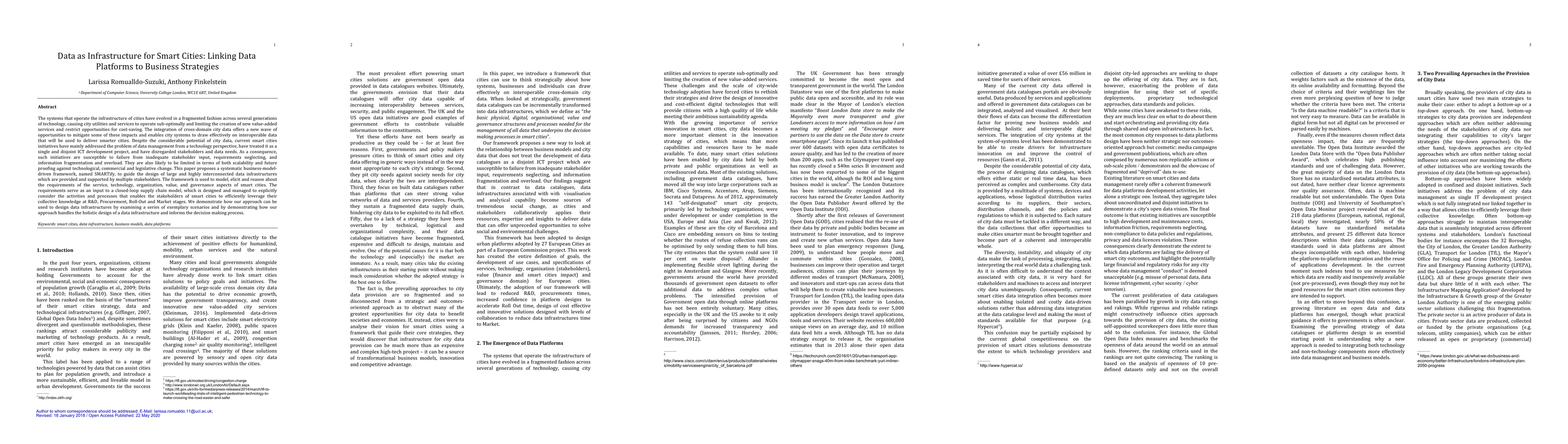 A business-model-driven framework is proposed to design data infrastructures for smart cities, focusing on stakeholder needs and scalability, and demonstrating its application in exemplary scenarios.