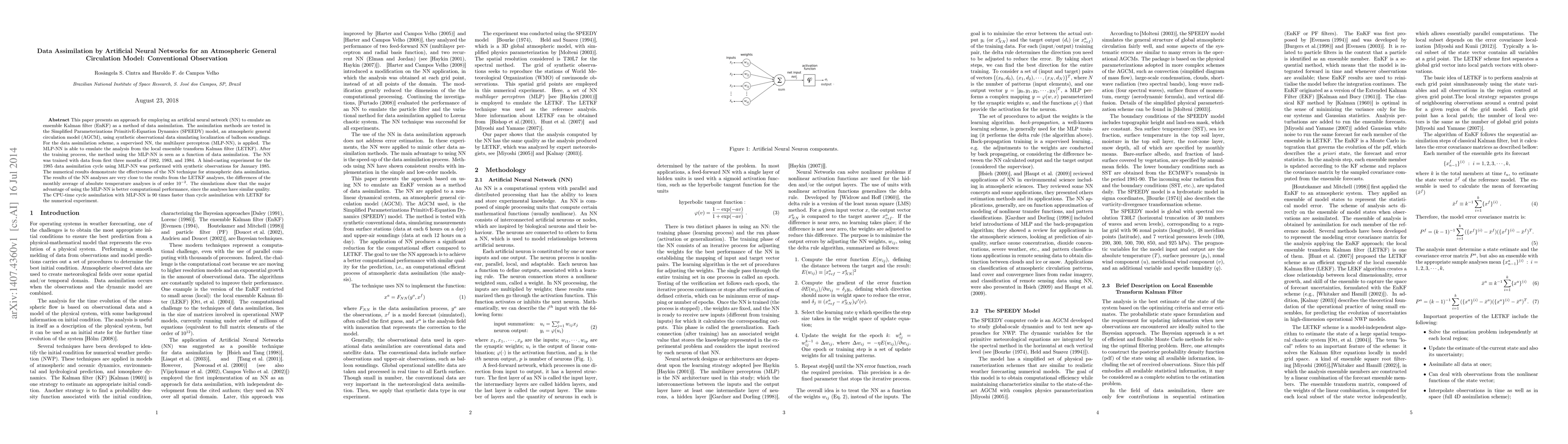 This paper explores using artificial neural networks (ANN) to emulate an ensemble Kalman filter for data assimilation in the SPEEDY atmospheric model, demonstrating comparable accuracy with significantly better computational efficiency. The multilayer perceptrons (MLP-NN) trained on synthetic observational data show similar performance to the local ensemble transform Kalman filter (LETKF), with a 90-fold reduction in computational time.