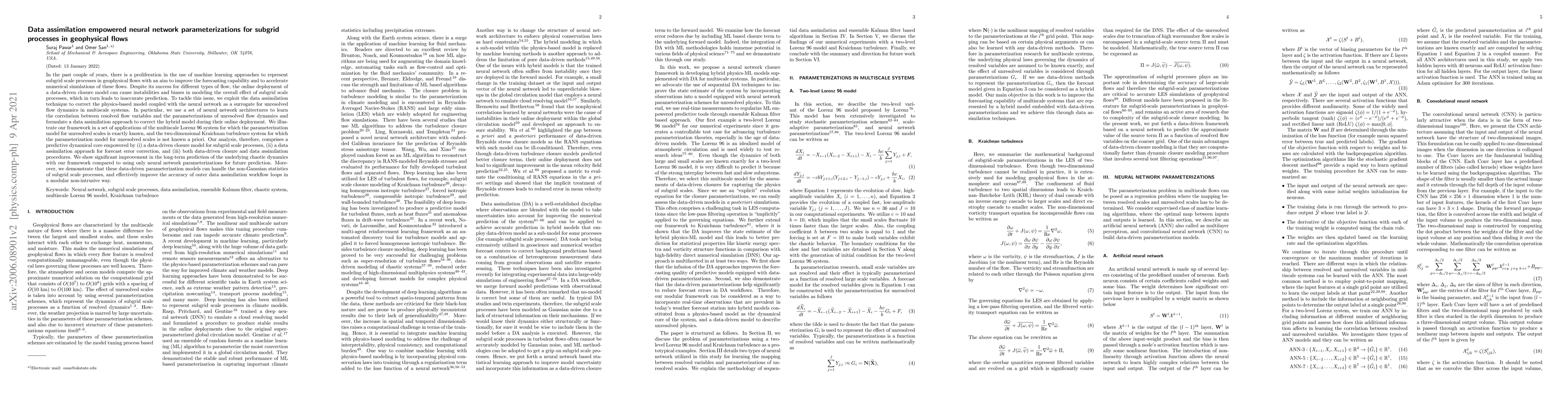 This paper proposes a hybrid neural network parameterization coupled with data assimilation to improve the modeling of subgrid scale processes in geophysical flows. The framework corrects the neural network model during online deployment, leading to significant enhancements in the long-term prediction accuracy for chaotic systems like the Lorenz 96 and Kraichnan turbulence models.