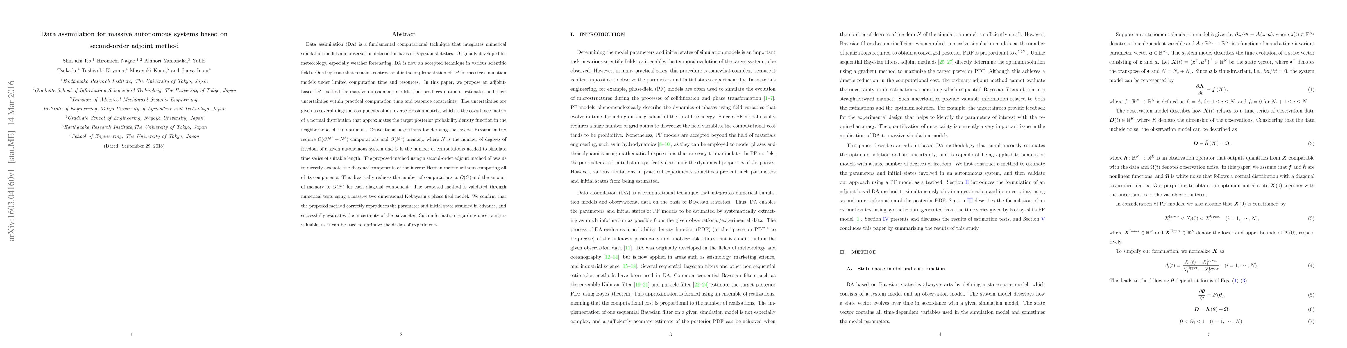 Researchers propose an efficient adjoint-based data assimilation method for massive autonomous systems, reducing computational time and resource requirements, and providing uncertainty estimates through inverse Hessian matrix components.