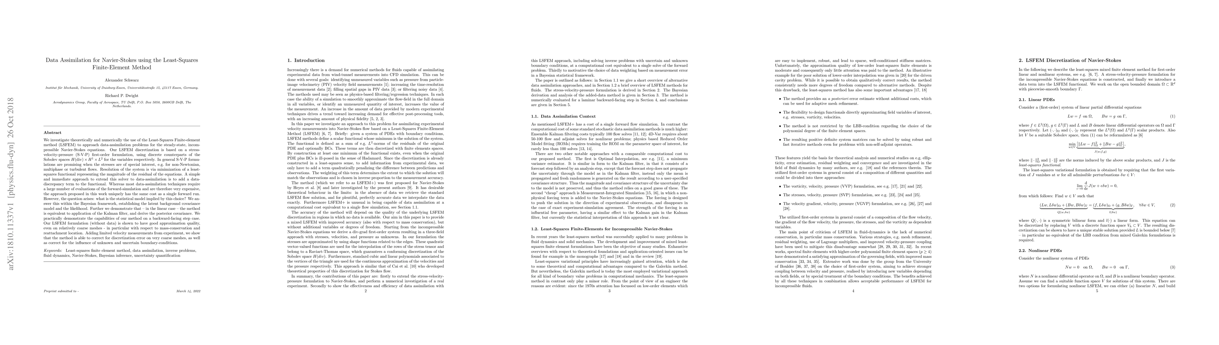 This paper explores the Least-Squares Finite-Element Method for data assimilation in steady-state Navier-Stokes equations, demonstrating its efficiency and equivalence to the Kalman filter in linear cases. The method corrects for discretization errors and uncertain boundary conditions using limited experimental velocity data.