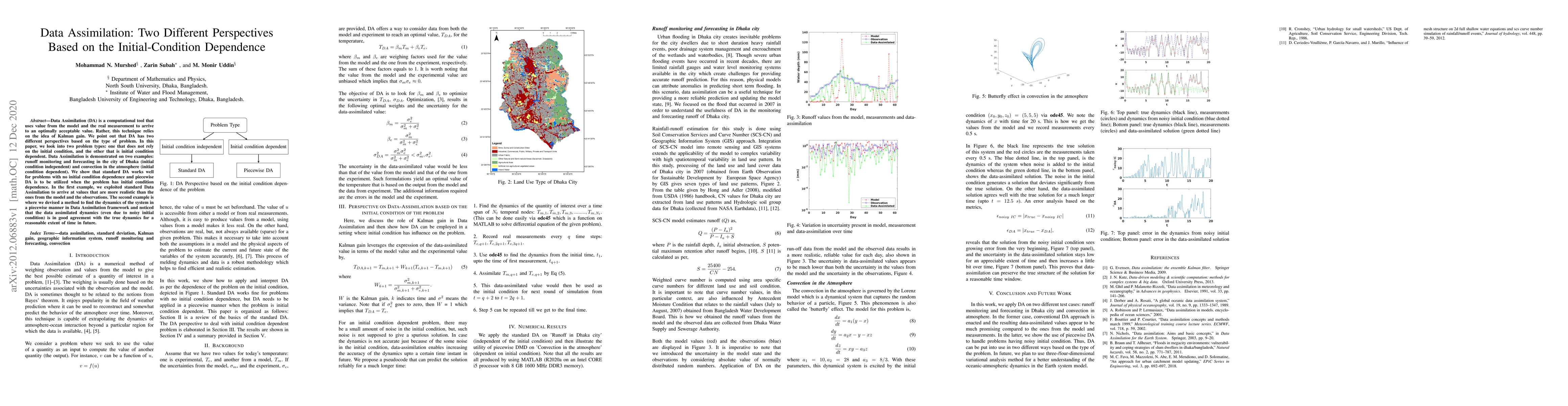 This paper explores two perspectives of Data Assimilation (DA), a technique blending model outputs and real measurements. It highlights that standard DA is effective for initial-condition independent problems, like Dhaka's runoff monitoring, while initial-condition dependent problems, such as atmospheric convection, require piecewise DA. The research demonstrates that standard DA provides more realistic values in the former, and piecewise DA accurately captures system dynamics in the latter, even with noisy initial conditions.