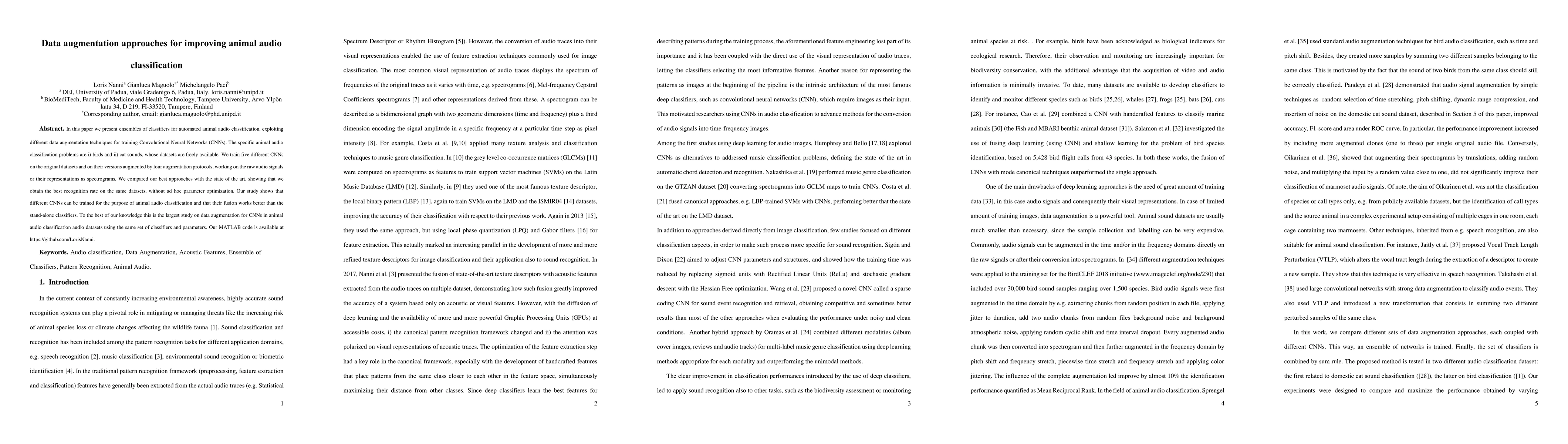 Researchers developed and compared various CNN-based approaches for animal audio classification using data augmentation techniques, achieving better recognition rates than the state of the art without ad hoc parameter optimization.