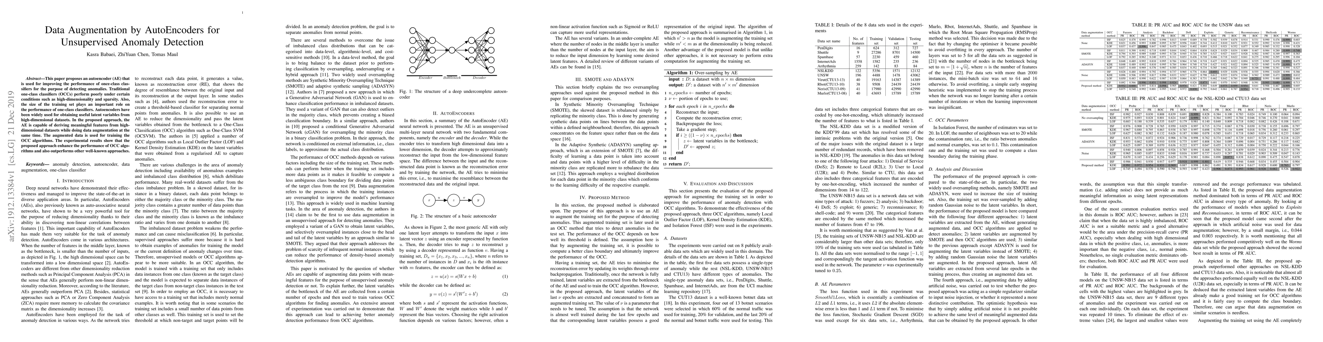 This paper proposes an autoencoder (AE) that is used for improving the performance of once-class classifiers for the purpose of detecting anomalies. Traditional one-class classifiers (OCCs) perform poorly under certain conditions such as high-dimensionality and sparsity. Also, the size of the training set plays an important role on the performance of one-class classifiers. Autoencoders have been widely used for obtaining useful latent variables from high-dimensional datasets. In the proposed approach, the AE is capable of deriving meaningful features from high-dimensional datasets while doing data augmentation at the same time. The augmented data is used for training the OCC algorithms. The experimental results show that the proposed approach enhance the performance of OCC algorithms and also outperforms other well-known approaches.