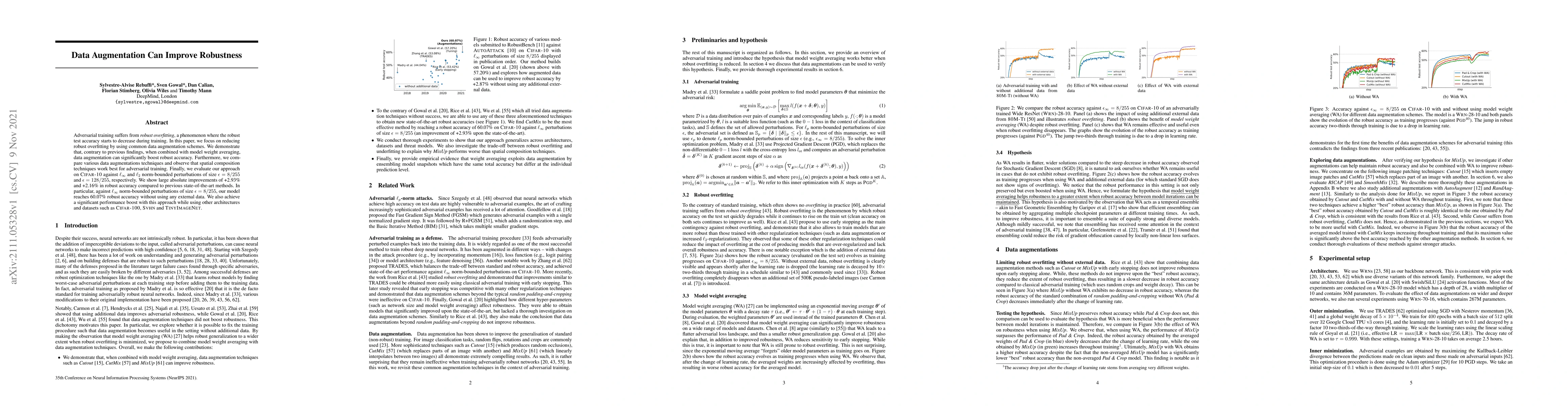 This paper demonstrates that data augmentation, when combined with model weight averaging, can significantly improve robust accuracy against adversarial attacks, reducing robust overfitting. Spatial composition techniques were found to be the most effective, achieving large improvements in robust accuracy on CIFAR-10 and other datasets.