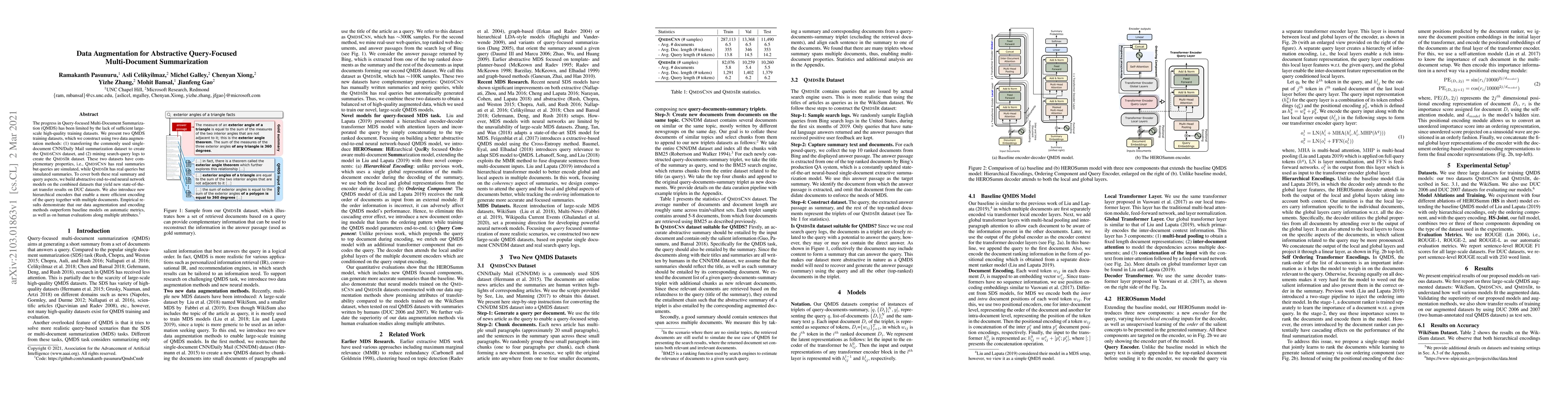 This paper introduces two new training datasets for Query-focused Multi-Document Summarization (QMDS) constructed via data augmentation, and shows that combining these datasets with new hierarchical encoders leads to state-of-the-art performance on DUC datasets, outperforming baseline models on both automatic metrics and human evaluations.