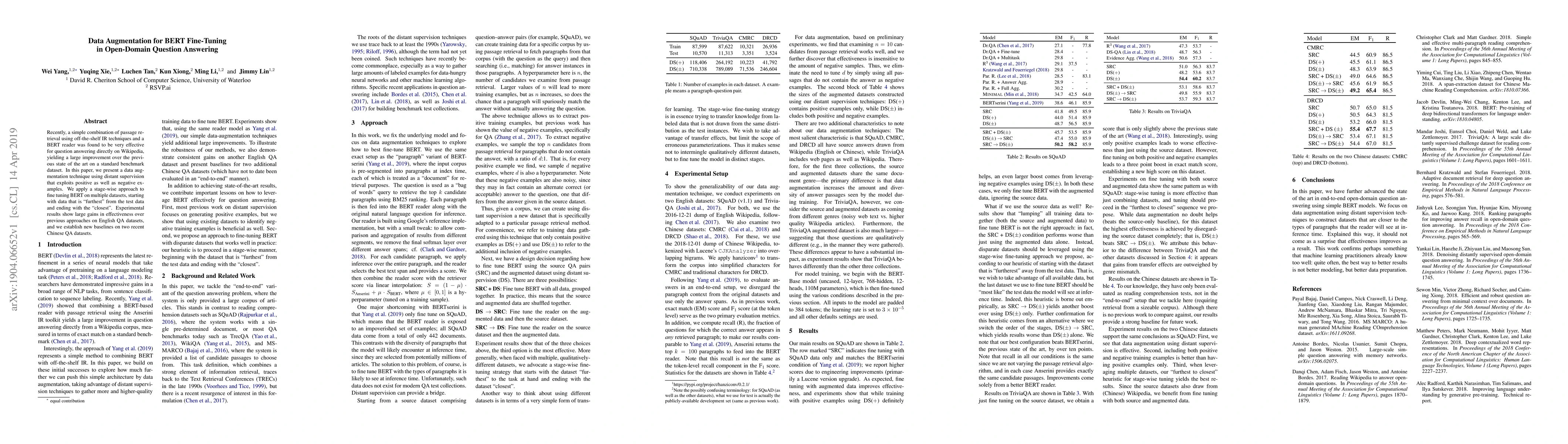 Recently, a simple combination of passage retrieval using off-the-shelf IR techniques and a BERT reader was found to be very effective for question answering directly on Wikipedia, yielding a large improvement over the previous state of the art on a standard benchmark dataset. In this paper, we present a data augmentation technique using distant supervision that exploits positive as well as negative examples. We apply a stage-wise approach to fine tuning BERT on multiple datasets, starting with data that is "furthest" from the test data and ending with the "closest". Experimental results show large gains in effectiveness over previous approaches on English QA datasets, and we establish new baselines on two recent Chinese QA datasets.