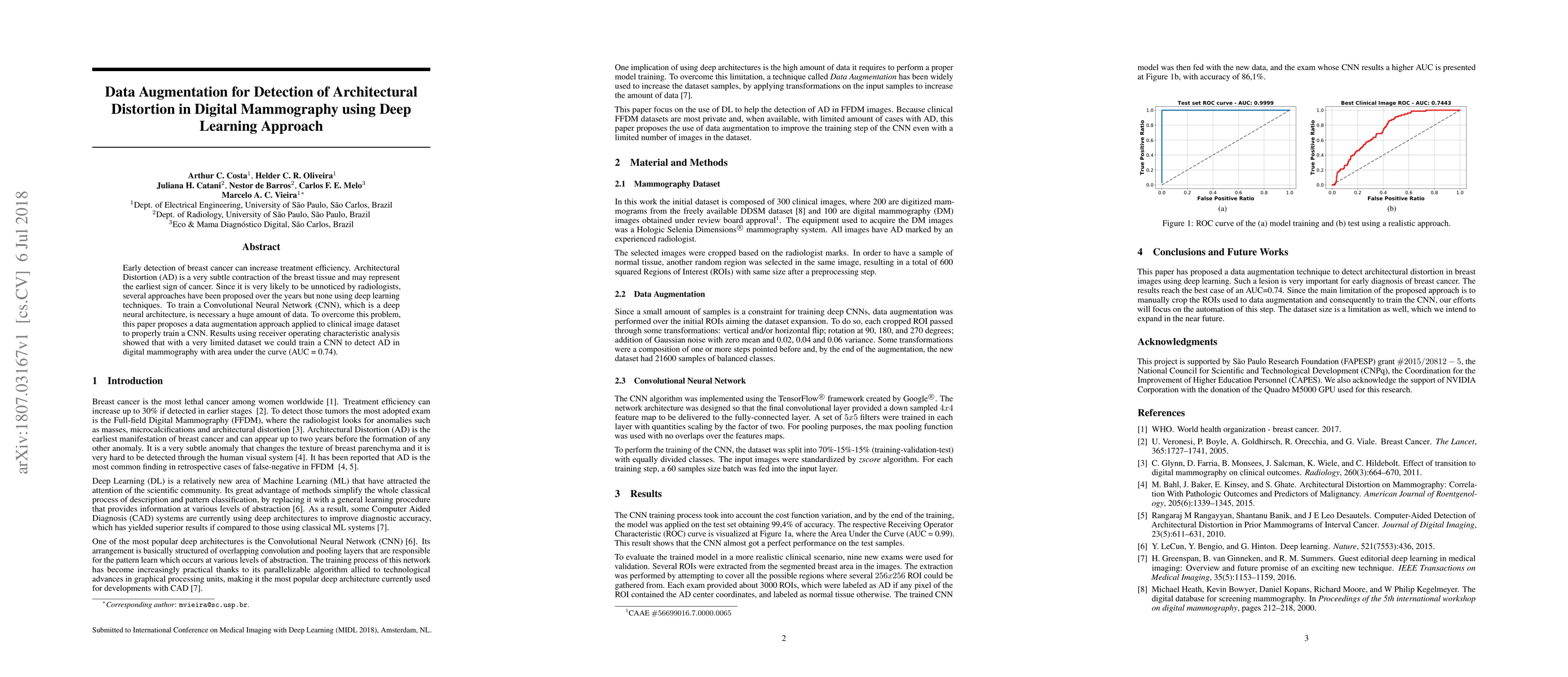 Early detection of breast cancer can increase treatment efficiency. Architectural Distortion (AD) is a very subtle contraction of the breast tissue and may represent the earliest sign of cancer. Since it is very likely to be unnoticed by radiologists, several approaches have been proposed over the years but none using deep learning techniques. To train a Convolutional Neural Network (CNN), which is a deep neural architecture, is necessary a huge amount of data. To overcome this problem, this paper proposes a data augmentation approach applied to clinical image dataset to properly train a CNN. Results using receiver operating characteristic analysis showed that with a very limited dataset we could train a CNN to detect AD in digital mammography with area under the curve (AUC = 0.74).