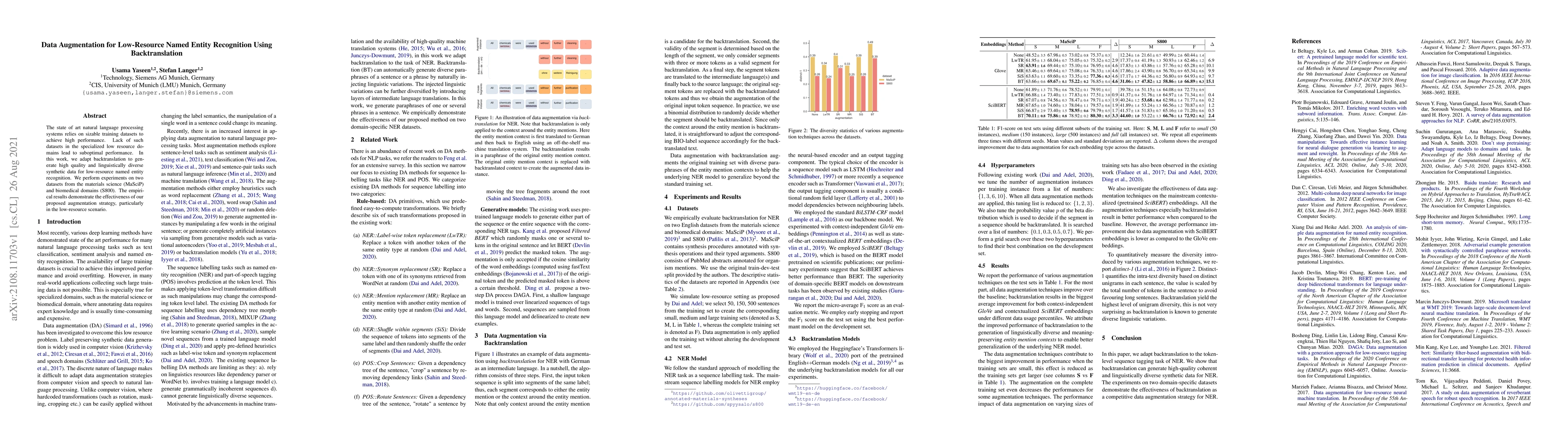 This study proposes using backtranslation to create synthetic data for low-resource named entity recognition, demonstrating its effectiveness in enhancing performance on specialized datasets in materials science and biomedical fields. Experimental results highlight the strategy’s success in improving recognition in domains lacking sufficient training data.
