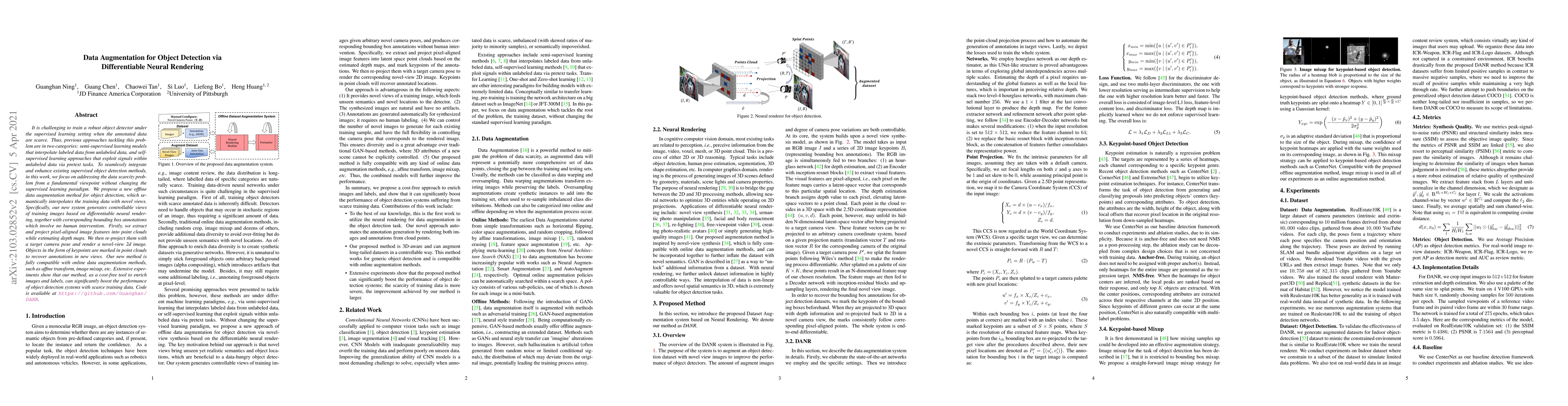 This paper proposes a new offline data augmentation method for object detection that uses differentiable neural rendering to generate novel views of training images and corresponding bounding box annotations. The method projects pixel-aligned features into point clouds and renders new images, significantly boosting detection performance with limited training data.