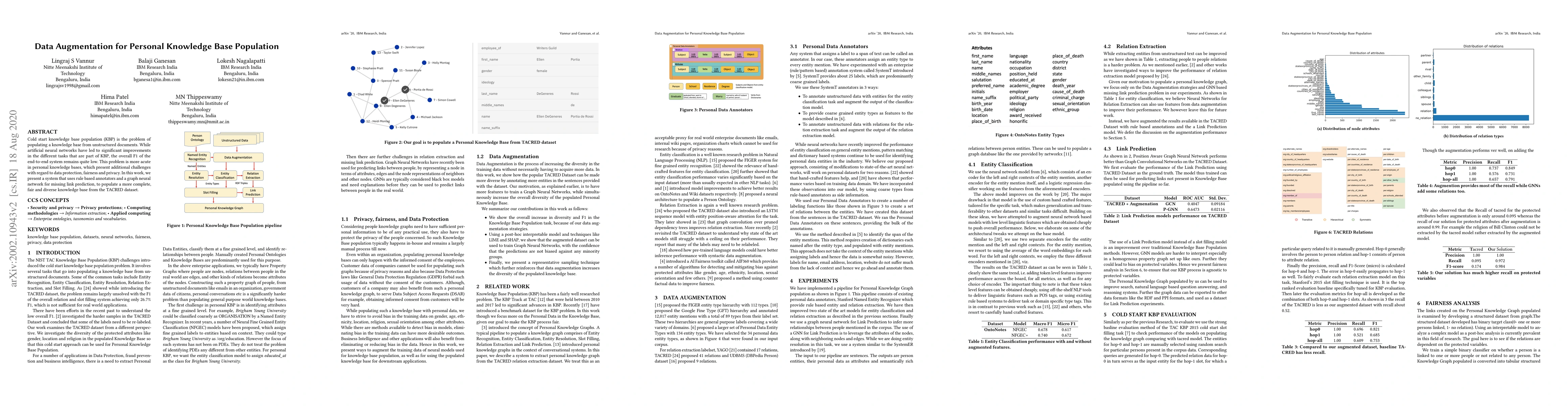 Cold start knowledge base population (KBP) is the problem of populating a knowledge base from unstructured documents. While artificial neural networks have led to significant improvements in the different tasks that are part of KBP, the overall F1 of the end-to-end system remains quite low. This problem is more acute in personal knowledge bases, which present additional challenges with regard to data protection, fairness and privacy. In this work, we present a system that uses rule based annotators and a graph neural network for missing link prediction, to populate a more complete, fair and diverse knowledge base from the TACRED dataset.