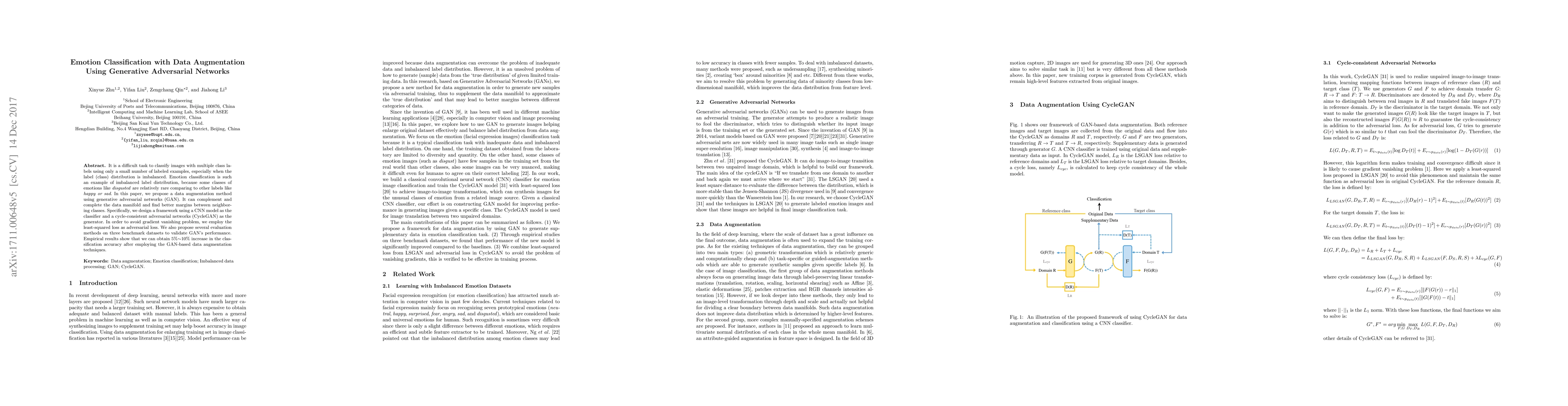 This paper proposes a data augmentation method using generative adversarial networks (GAN) to improve emotion classification accuracy, especially for imbalanced datasets. The framework combines a CNN classifier with CycleGAN for generating synthetic data, achieving a 5%~10% increase in classification accuracy on benchmark datasets.