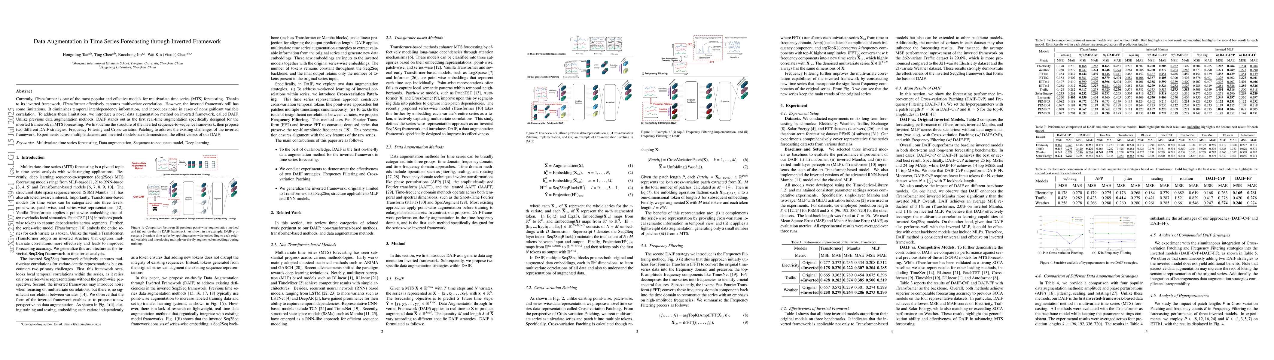 The paper introduces DAIF, a real-time data augmentation method designed for the inverted framework in multivariate time series forecasting. DAIF, consisting of Frequency Filtering and Cross-variation Patching strategies, addresses limitations of the existing inverted framework by preserving temporal interdependency information and reducing noise from nonsignificant variable correlation, as demonstrated through experiments on various datasets and inverted models.