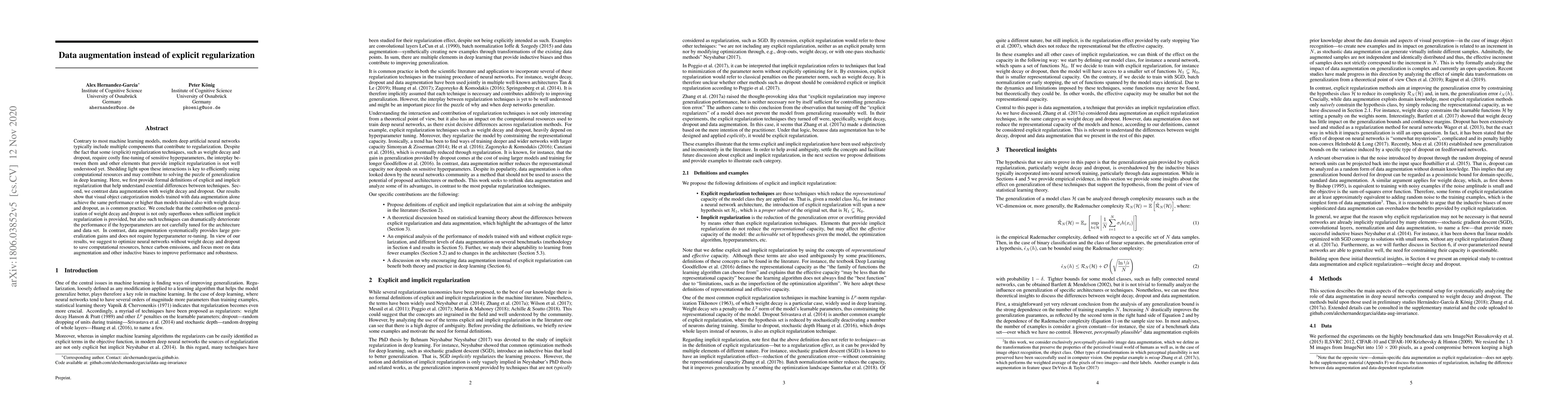 This paper argues that data augmentation can replace explicit regularization techniques like weight decay and dropout in deep neural networks, achieving similar or better performance without the need for hyperparameter tuning. It suggests optimizing networks solely through data augmentation to save computational resources and improve generalization.