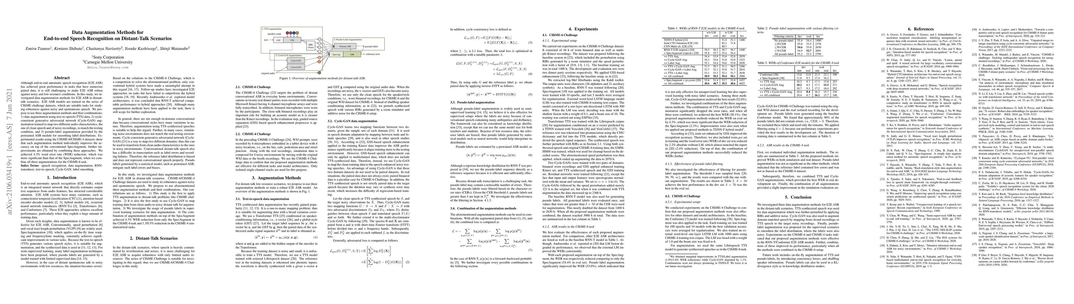 This study explores data augmentation techniques to enhance end-to-end automatic speech recognition (E2E ASR) models for distant-talk scenarios. The proposed methods include TTS data augmentation, Cycle-GAN for mapping clean speech to noisy conditions, and pseudo-label augmentation. Results show individual and combined improvements over SpecAugment, achieving a 4.3% word error rate (WER) reduction in CHiME-6.