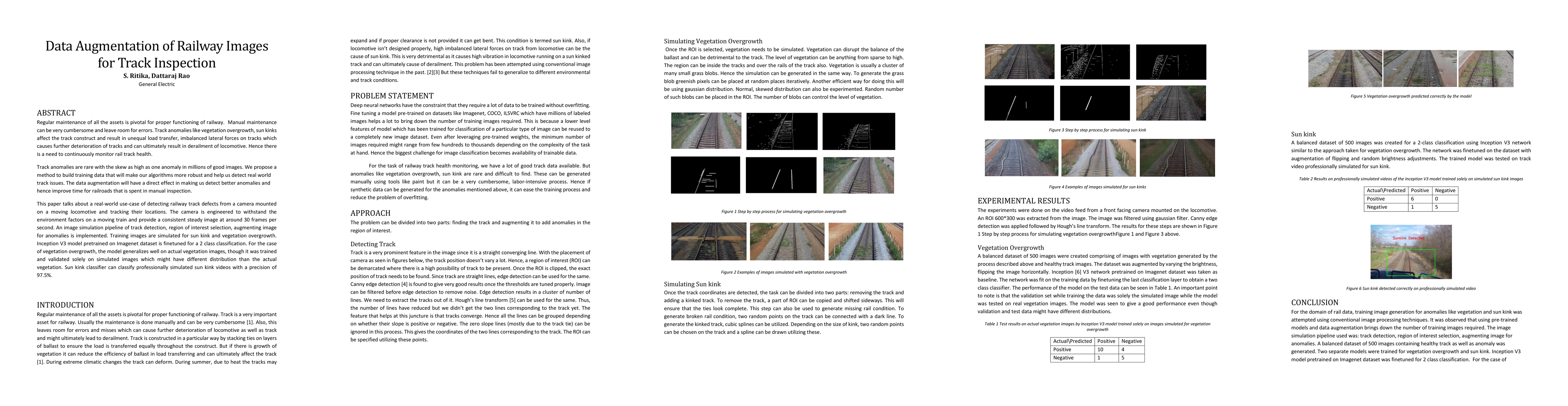 Regular maintenance of all the assets is pivotal for proper functioning of railway. Manual maintenance can be very cumbersome and leave room for errors. Track anomalies like vegetation overgrowth, sun kinks affect the track construct and result in unequal load transfer, imbalanced lateral forces on tracks which causes further deterioration of tracks and can ultimately result in derailment of locomotive. Hence there is a need to continuously monitor rail track health. Track anomalies are rare with the skew as high as one anomaly in millions of good images. We propose a method to build training data that will make our algorithms more robust and help us detect real world track issues. The data augmentation will have a direct effect in making us detect better anomalies and hence improve time for railroads that is spent in manual inspection. This paper talks about a real world use case of detecting railway track defects from a camera mounted on a moving locomotive and tracking their locations. The camera is engineered to withstand the environment factors on a moving train and provide a consistent steady image at around 30 frames per second. An image simulation pipeline of track detection, region of interest selection, augmenting image for anomalies is implemented. Training images are simulated for sun kink and vegetation overgrowth. Inception V3 model pretrained on Imagenet dataset is finetuned for a 2 class classification. For the case of vegetation overgrowth, the model generalizes well on actual vegetation images, though it was trained and validated solely on simulated images which might have different distribution than the actual vegetation. Sun kink classifier can classify professionally simulated sun kink videos with a precision of 97.5%.