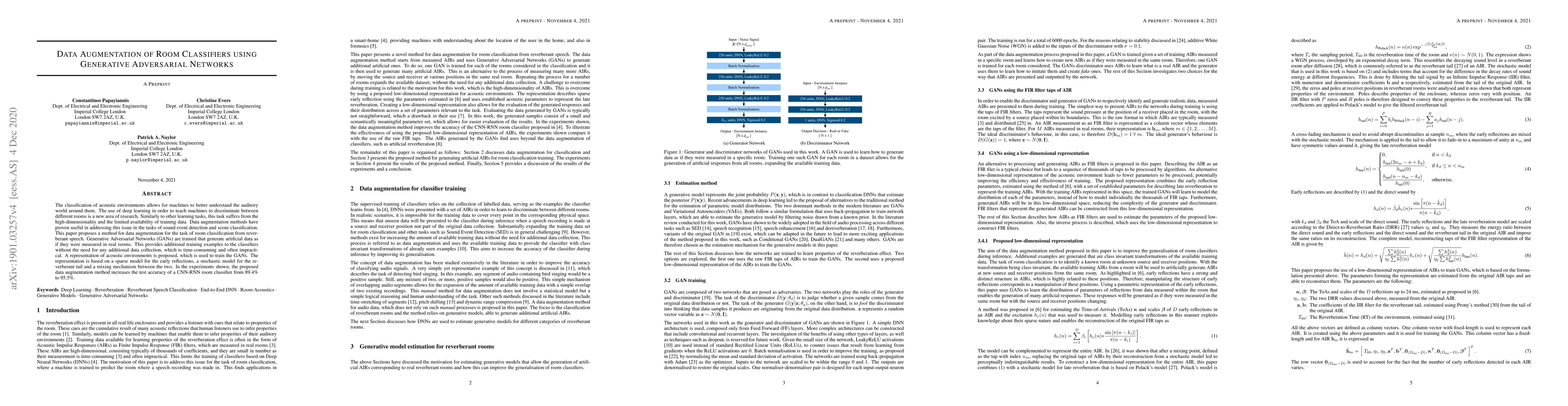 This paper proposes a data augmentation method using Generative Adversarial Networks (GANs) to enhance room classification from reverberant speech. The GANs generate artificial data, improving CNN-RNN classifier accuracy from 89.4% to 95.5% without additional data collection.