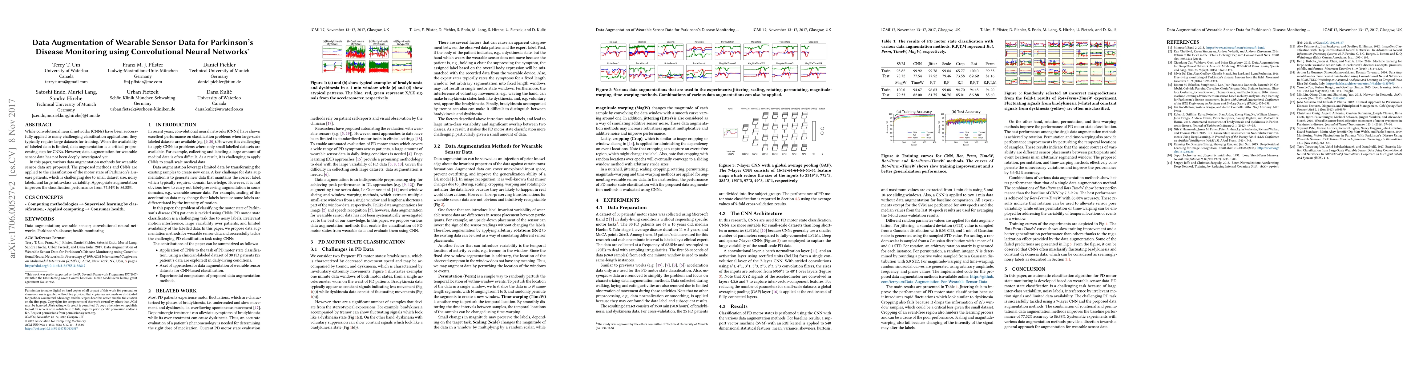 This paper proposes various data augmentation techniques for wearable sensor data to enhance the training of convolutional neural networks (CNNs) for classifying the motor states of Parkinson's Disease patients. The results show a significant improvement in classification performance, raising it from 77.54% to 86.88%.