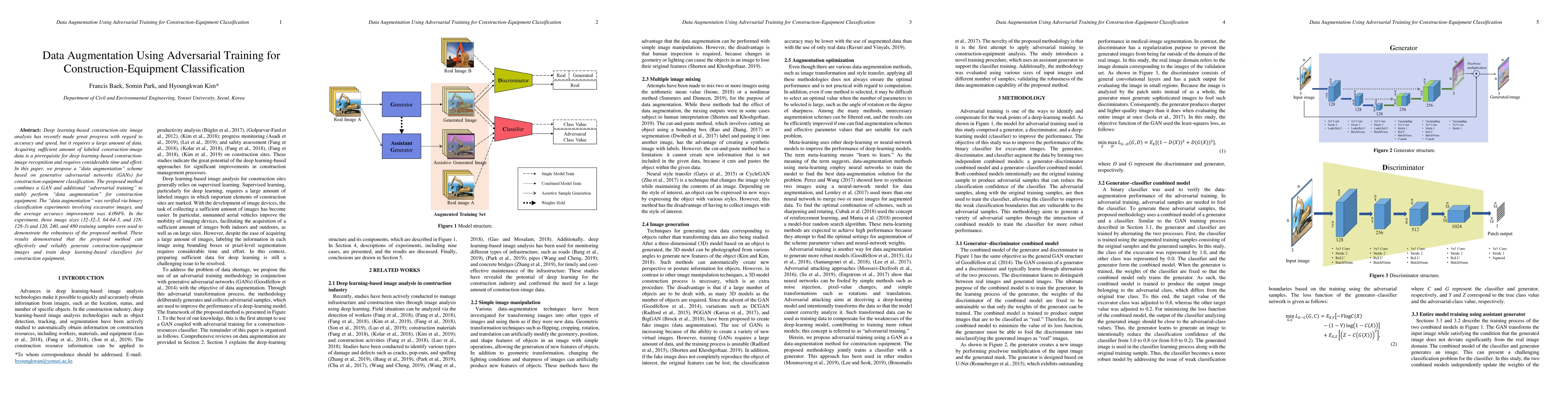 This paper proposes a data augmentation method using generative adversarial networks (GANs) and adversarial training to enhance construction-equipment classification. The approach effectively generates additional training data, resulting in a 4.094% average accuracy improvement in binary classification experiments with excavator images.