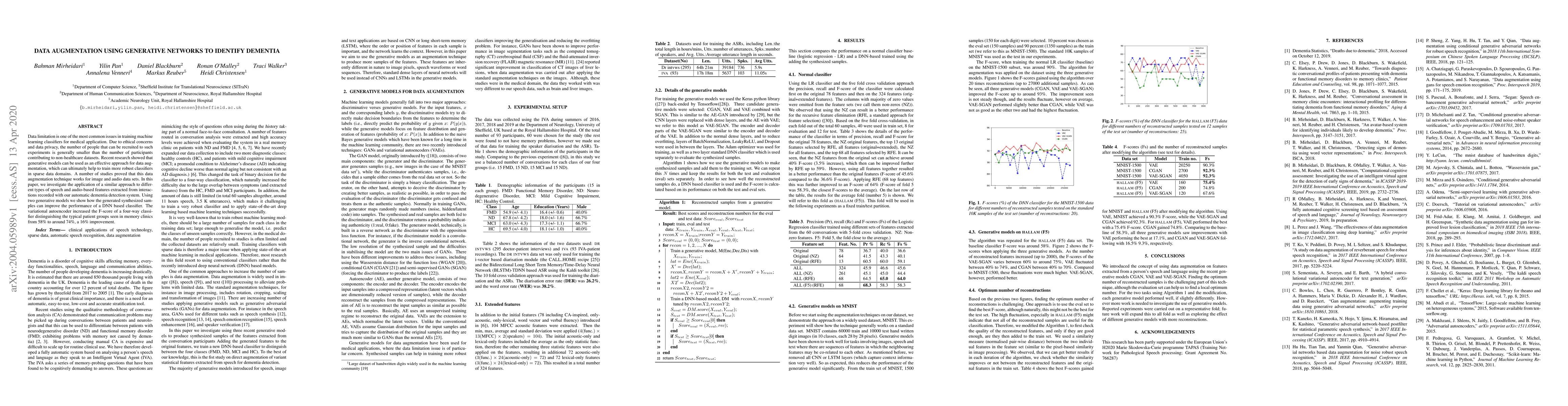 Data limitation is one of the most common issues in training machine learning classifiers for medical applications. Due to ethical concerns and data privacy, the number of people that can be recruited to such experiments is generally smaller than the number of participants contributing to non-healthcare datasets. Recent research showed that generative models can be used as an effective approach for data augmentation, which can ultimately help to train more robust classifiers sparse data domains. A number of studies proved that this data augmentation technique works for image and audio data sets. In this paper, we investigate the application of a similar approach to different types of speech and audio-based features extracted from interactions recorded with our automatic dementia detection system. Using two generative models we show how the generated synthesized samples can improve the performance of a DNN based classifier. The variational autoencoder increased the F-score of a four-way classifier distinguishing the typical patient groups seen in memory clinics from 58% to around 74%, a 16% improvement