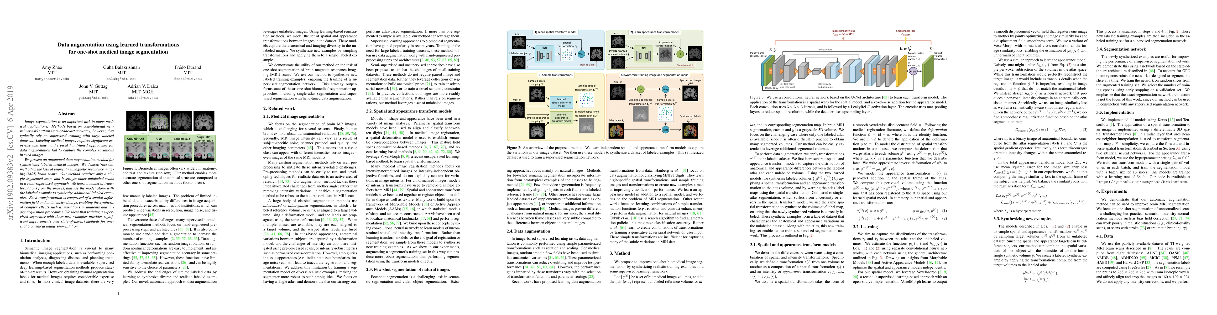 Image segmentation is an important task in many medical applications. Methods based on convolutional neural networks attain state-of-the-art accuracy; however, they typically rely on supervised training with large labeled datasets. Labeling medical images requires significant expertise and time, and typical hand-tuned approaches for data augmentation fail to capture the complex variations in such images. We present an automated data augmentation method for synthesizing labeled medical images. We demonstrate our method on the task of segmenting magnetic resonance imaging (MRI) brain scans. Our method requires only a single segmented scan, and leverages other unlabeled scans in a semi-supervised approach. We learn a model of transformations from the images, and use the model along with the labeled example to synthesize additional labeled examples. Each transformation is comprised of a spatial deformation field and an intensity change, enabling the synthesis of complex effects such as variations in anatomy and image acquisition procedures. We show that training a supervised segmenter with these new examples provides significant improvements over state-of-the-art methods for one-shot biomedical image segmentation. Our code is available at https://github.com/xamyzhao/brainstorm.