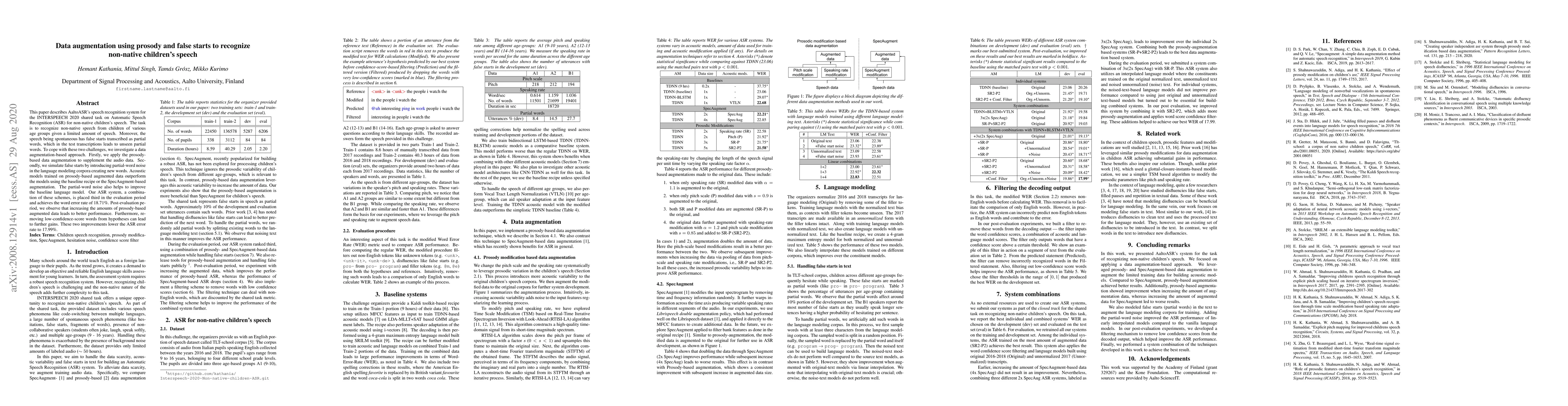 This paper describes AaltoASR's speech recognition system for the INTERSPEECH 2020 shared task on Automatic Speech Recognition (ASR) for non-native children's speech. The task is to recognize non-native speech from children of various age groups given a limited amount of speech. Moreover, the speech being spontaneous has false starts transcribed as partial words, which in the test transcriptions leads to unseen partial words. To cope with these two challenges, we investigate a data augmentation-based approach. Firstly, we apply the prosody-based data augmentation to supplement the audio data. Secondly, we simulate false starts by introducing partial-word noise in the language modeling corpora creating new words. Acoustic models trained on prosody-based augmented data outperform the models using the baseline recipe or the SpecAugment-based augmentation. The partial-word noise also helps to improve the baseline language model. Our ASR system, a combination of these schemes, is placed third in the evaluation period and achieves the word error rate of 18.71%. Post-evaluation period, we observe that increasing the amounts of prosody-based augmented data leads to better performance. Furthermore, removing low-confidence-score words from hypotheses can lead to further gains. These two improvements lower the ASR error rate to 17.99%.