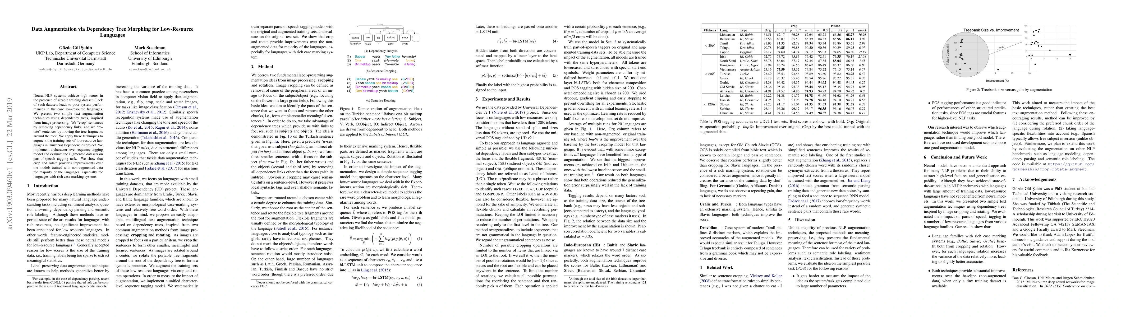 This paper proposes two dependency tree-based text augmentation techniques—cropping and rotating—to enhance neural NLP systems for low-resource languages. The methods improve part-of-speech tagging performance, especially for languages with complex case marking, by augmenting training datasets from the Universal Dependencies project.
